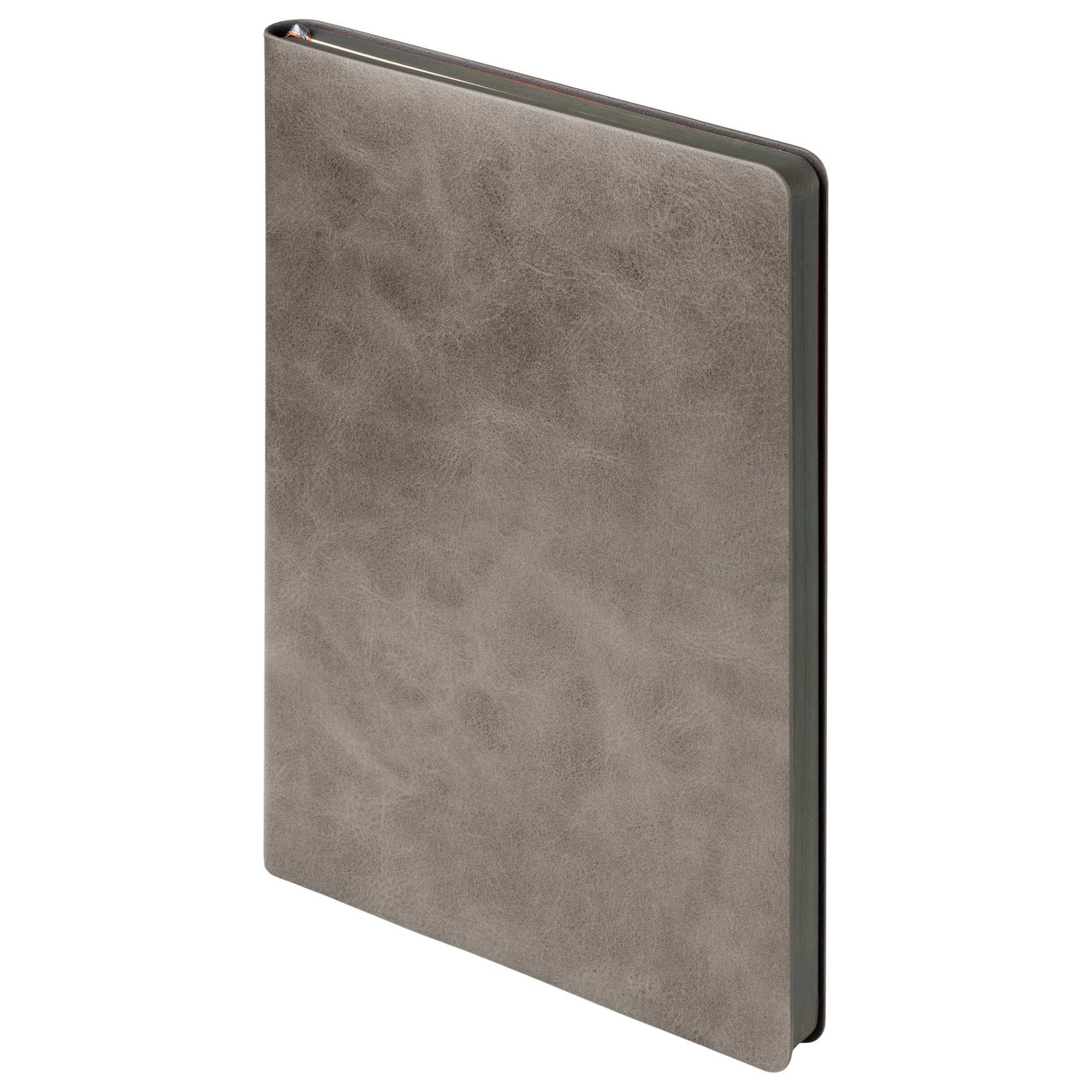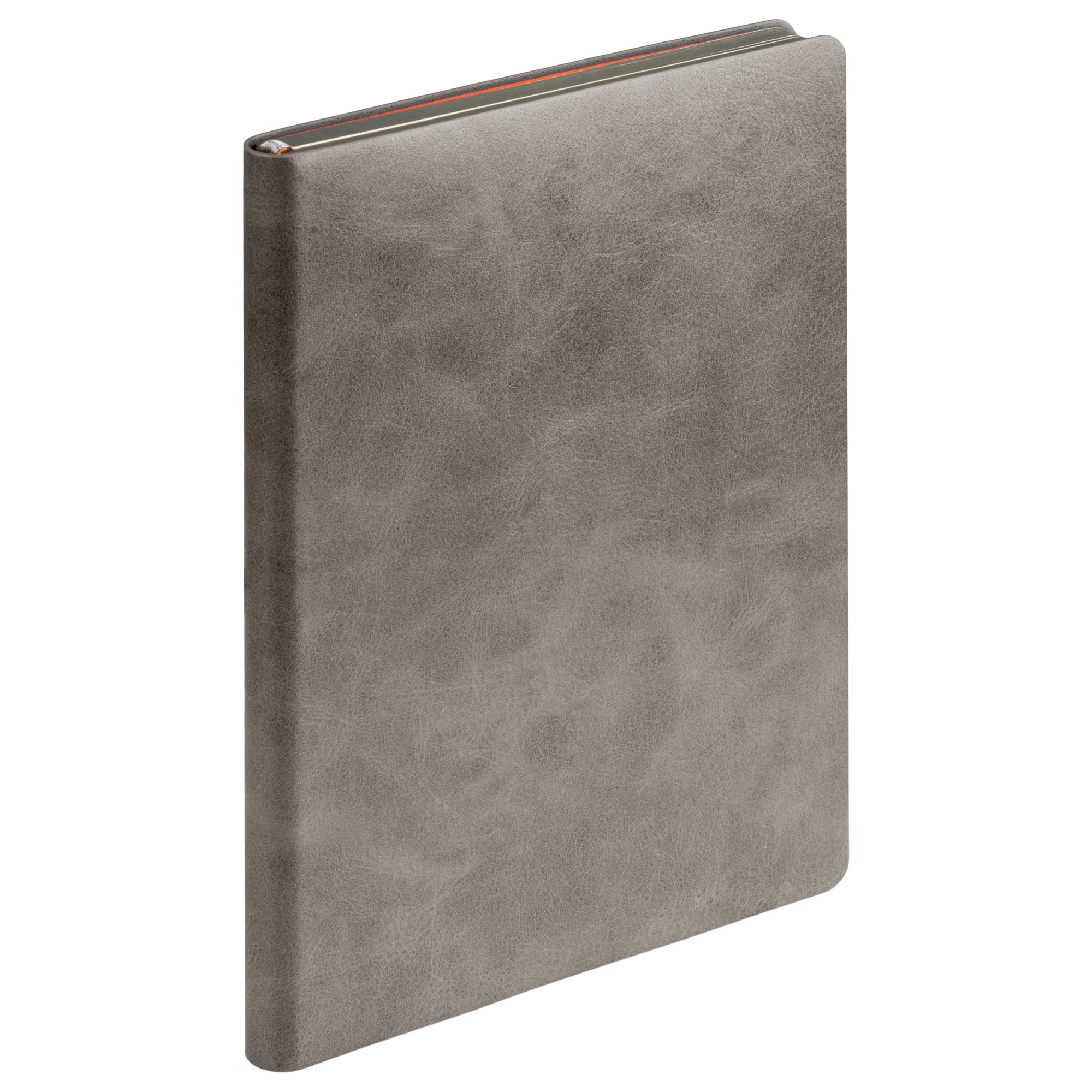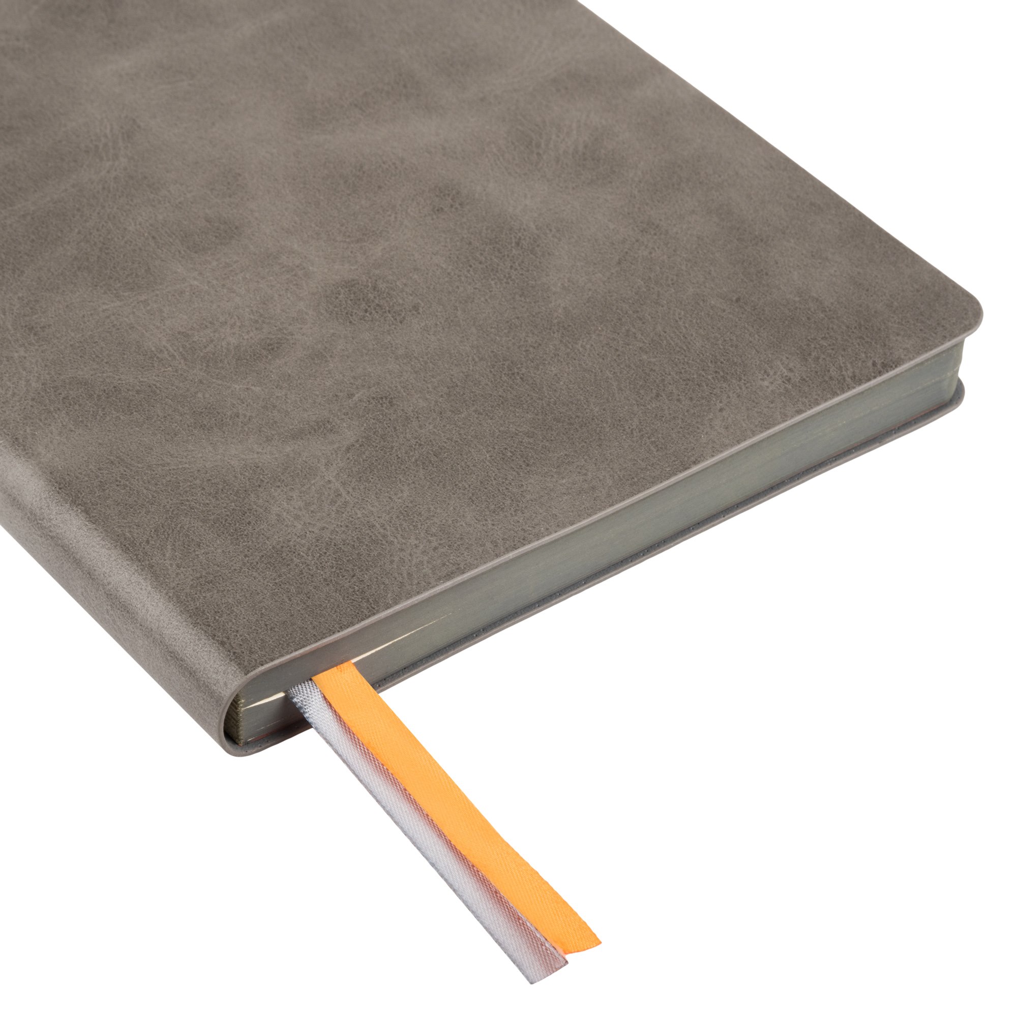 Яркий и в то же время лаконичный недатированный ежедневник выполнен в современном дизайне. Цветовая палитра составлена из контрастных ярких и приглушенных тонов. Гибкая обложка из искусственной полуглянцевой кожи (материал Voyage/Atlas) со скругленными уголками. Поверхность слегка фактурная, с едва ощутимой сеткой мелких морщинок и прожилок. Цвет – серый, естественный, спокойный, с неоднородным рисунком, напоминающим мраморные разводы и мягкими переходами тона от темного к более светлому. Форзац и нахзац матовые, сочного оранжевого цвета. Теплые кремовые страницы со скругленными уголками выполнены из гладкого шелковистого офсета. Срез серый, матовый. Изделие дополнено двойным атласным ляссе, составленным из лент серого и оранжевого цветов. Ленты имеют легкий блеск, ширина каждой 6 мм.