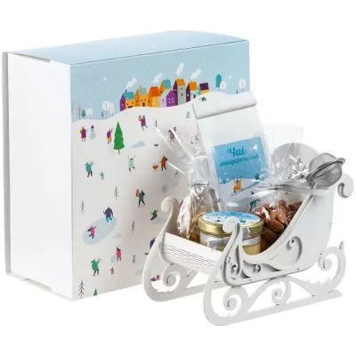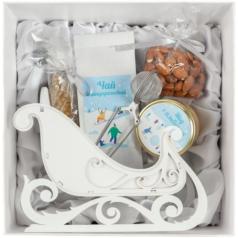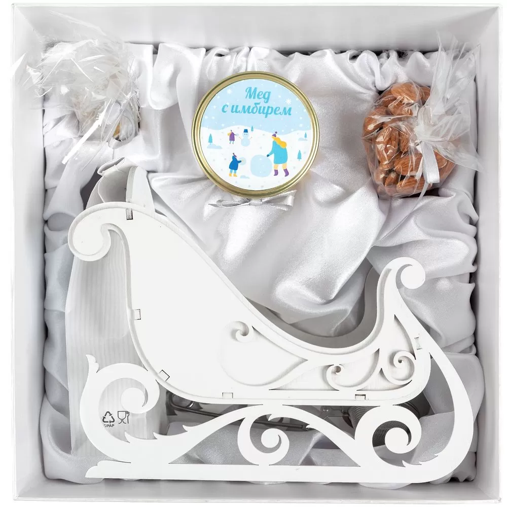 - белые сани деревянные — эффектная упаковка, а также украшение новогоднего стола.