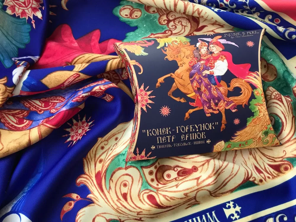 Прочитав сказку юного дарования, сам великий Александр Сергеевич Пушкин сказал: Этот род сочинений я могу теперь оставить - и Петр Ершов был принят в круг петербургских писателей.В этом году сказке из золотого фонда русской литературы, переведенной на все языки мира, исполняется 185 лет. Ее яркие краски мы перенесли на шелк и создали платок Конек-Горбунок. Благодаря тонкой работе дизайнера, со страниц книги, как живые, сошли герои любимой с детства истории: Иван, прекрасная Царь-девица и волшебный Конек-Горбунок. А в роскошных орнаментах сплелись легендарное перо Жар-птицы, Красное Солнышко и Месяц…