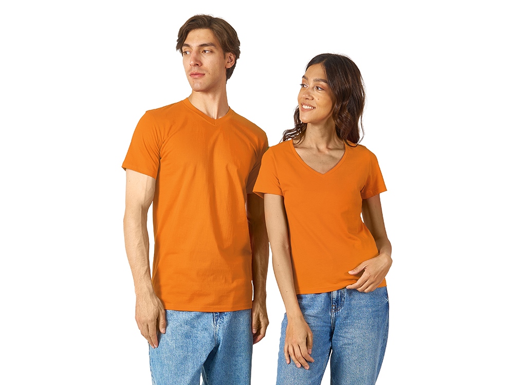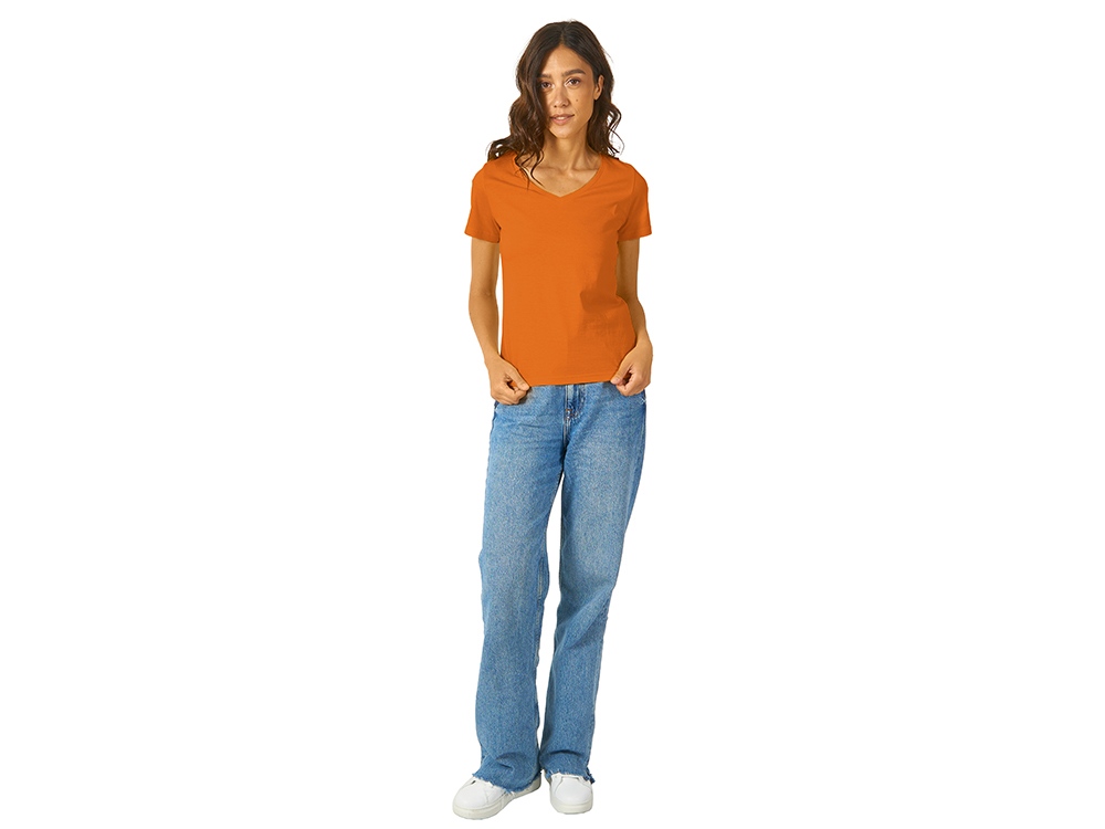 Женская футболка из натурального хлопка с элегантным V-образным вырезом. Материал отлично подходит для нанесения рекламной информации. Натуральная ткань не вызывает раздражения кожи.