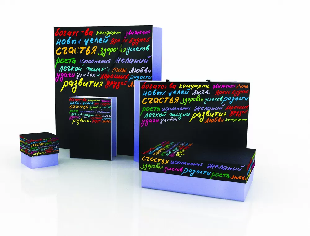 Подарочные пакеты и коробки этой серии совмещают в себе функции упаковки и открытки: на них уже написаны всевозможные пожелания. Для этой серии, выпущенной небольшим тиражом, специально разработан авторский дизайн. Пакеты и коробки отпечатаны с применением лучших полиграфических технологий и заламинированы. На свободном от декора черном поле можно разместить логотип компании, текст или рисунок.Возможные способы и стоимость нанесения логотипа предоставляются по запросу.