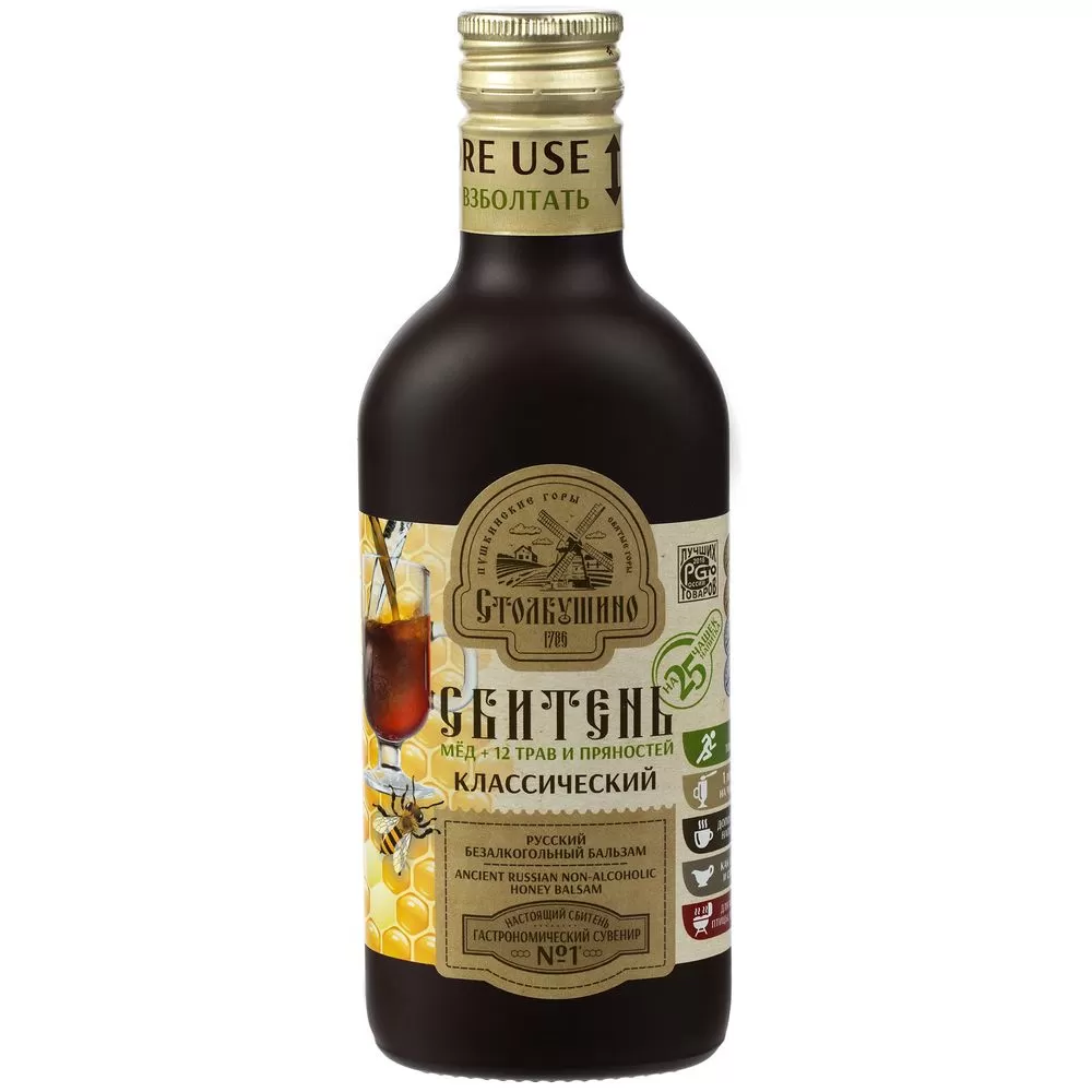 - сбитень классический, 250 мл (состав: мед натуральный, сахар, вода питьевая, мята, базилик, душица, корица, кориандр, имбирь, гвоздика, корень аира, зверобой, кардамон, мускатный орех, корень солодки, сок лимона);