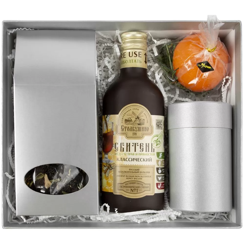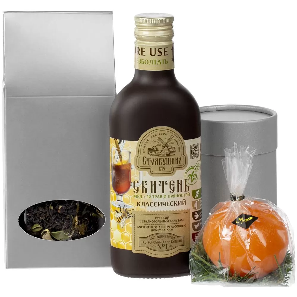 - чай «Таежный сбор» в индивидуальном пакете и серебристой коробке с окном, вес 70 г (состав: черный индийский чай, лист брусники, мальва, календула, можжевельник, боярышник, клюква, мята, ароматизирован маслами);