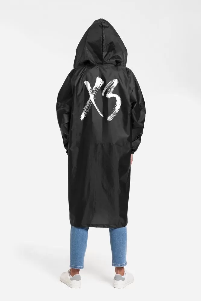 Плащ-дождевик из ткани таффета на молнии с капюшоном. Складывается в мешочек — удобно брать с собой.