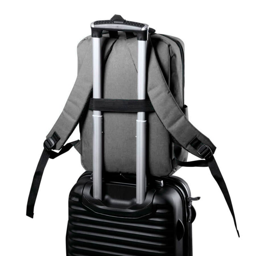 · Специальная стропа на спинке для крепления рюкзака на выдвижную ручку чемодана