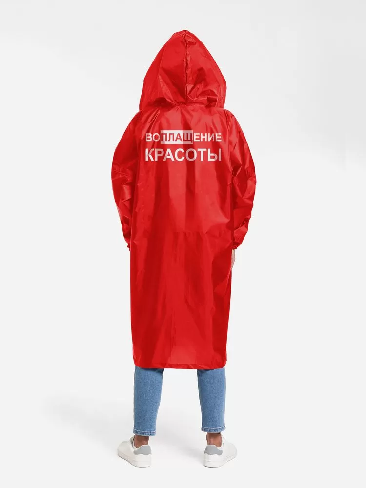 Серия дождевиков с принтом «Воплащение» для тех, кто и в дождливую погоду готов преображаться и шутить. Ум и скромность, красота, а может быть порок? «Воплащение красоты» — плащ для исключительно красивых людей. Особенно — для красивых душой.Плащ-дождевик из ткани таффета на молнии с капюшоном. Складывается в мешочек — удобно брать с собой.