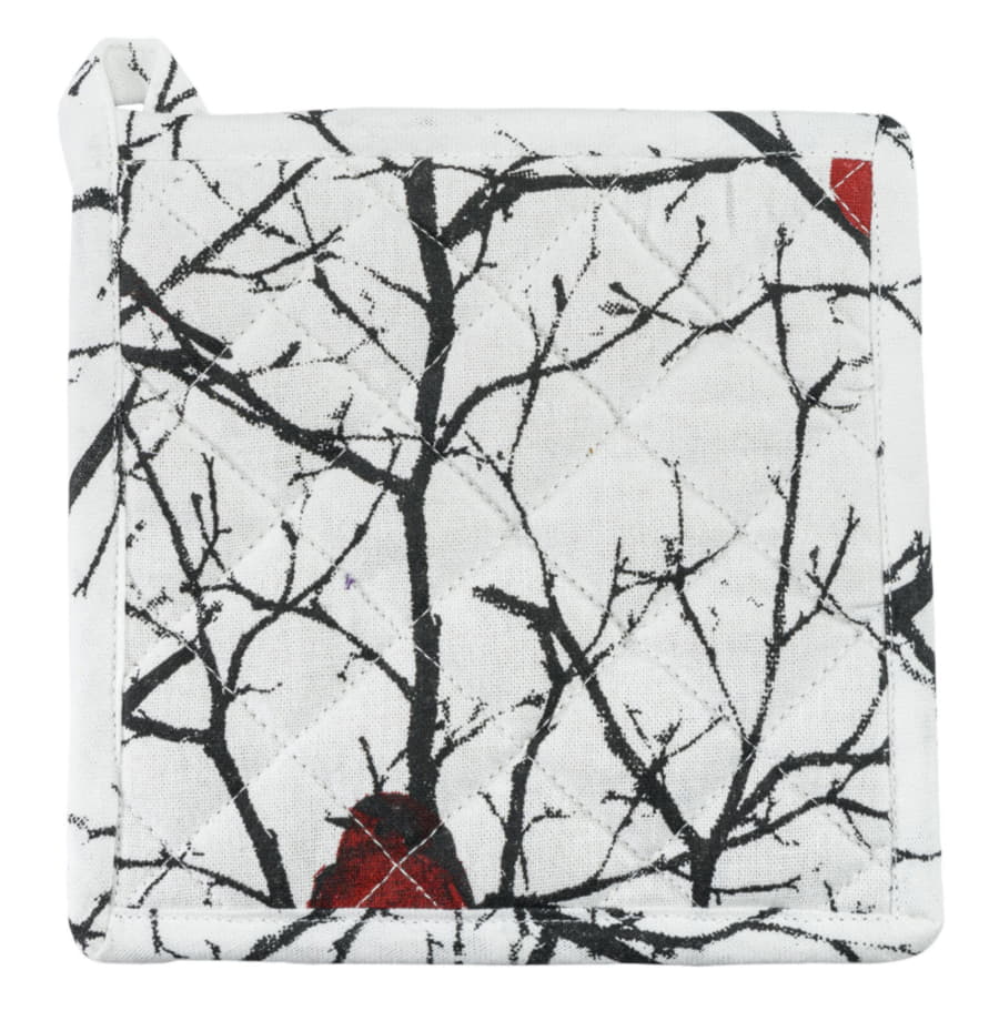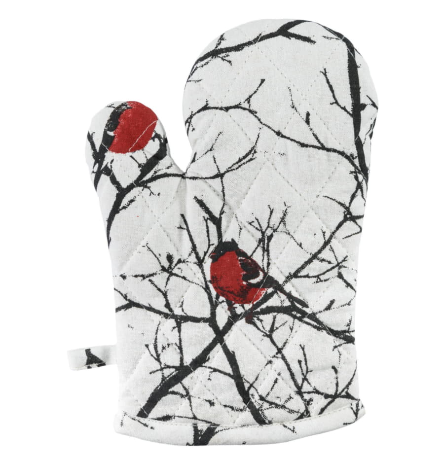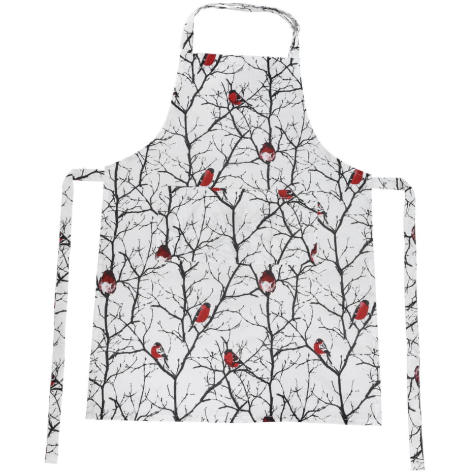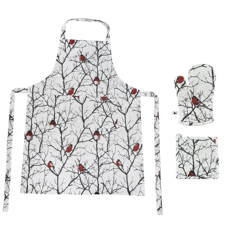 Снегирь – типичный символ русской зимы. Зима надежно замешана даже в название этих птиц – снегири, снежные птахи. Ярко-красные шарики с толстыми клювами и черными шапочками, усыпавшие ветки и так контрастирующие с ослепительно-снежным зимним лесом, - такой образ снегиря, без сомнения, знаком каждому с детства. Он кочует с одной книжной страницы на другую, перелетает с открытки на открытку, а теперь он и на всех предметах подарочного набора: на переднике и двух прихватках. Передник защитит вашу одежду во время активного приготовления новогодних блюд, а прихватки надежно сберегут ваши руки от ожогов.