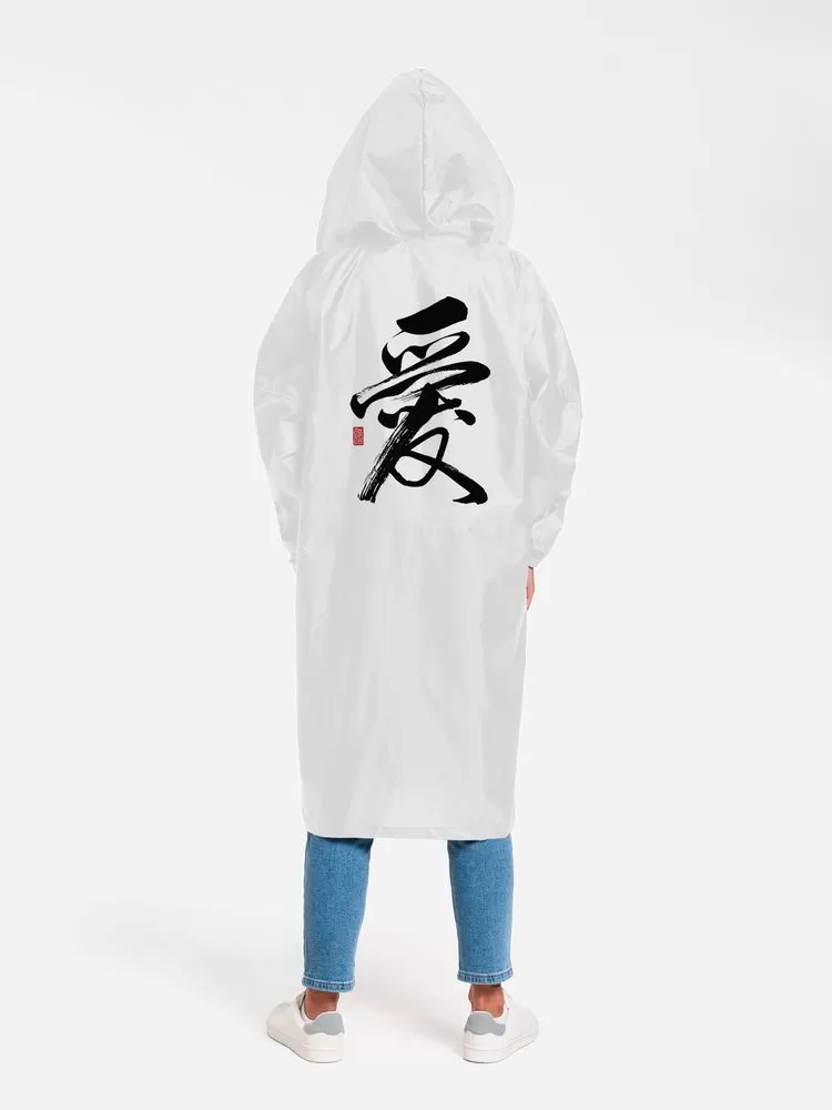 Иероглифы коллекции «Вечные ценности» выполнены в жанре каллиграфии на древнекитайском диалекте мандарин. Плавные линии символизируют внутренний баланс и фокусировку на главных жизненных ориентирах.Плащ-дождевик из ткани таффета на молнии с капюшоном. Складывается в мешочек — удобно брать с собой.