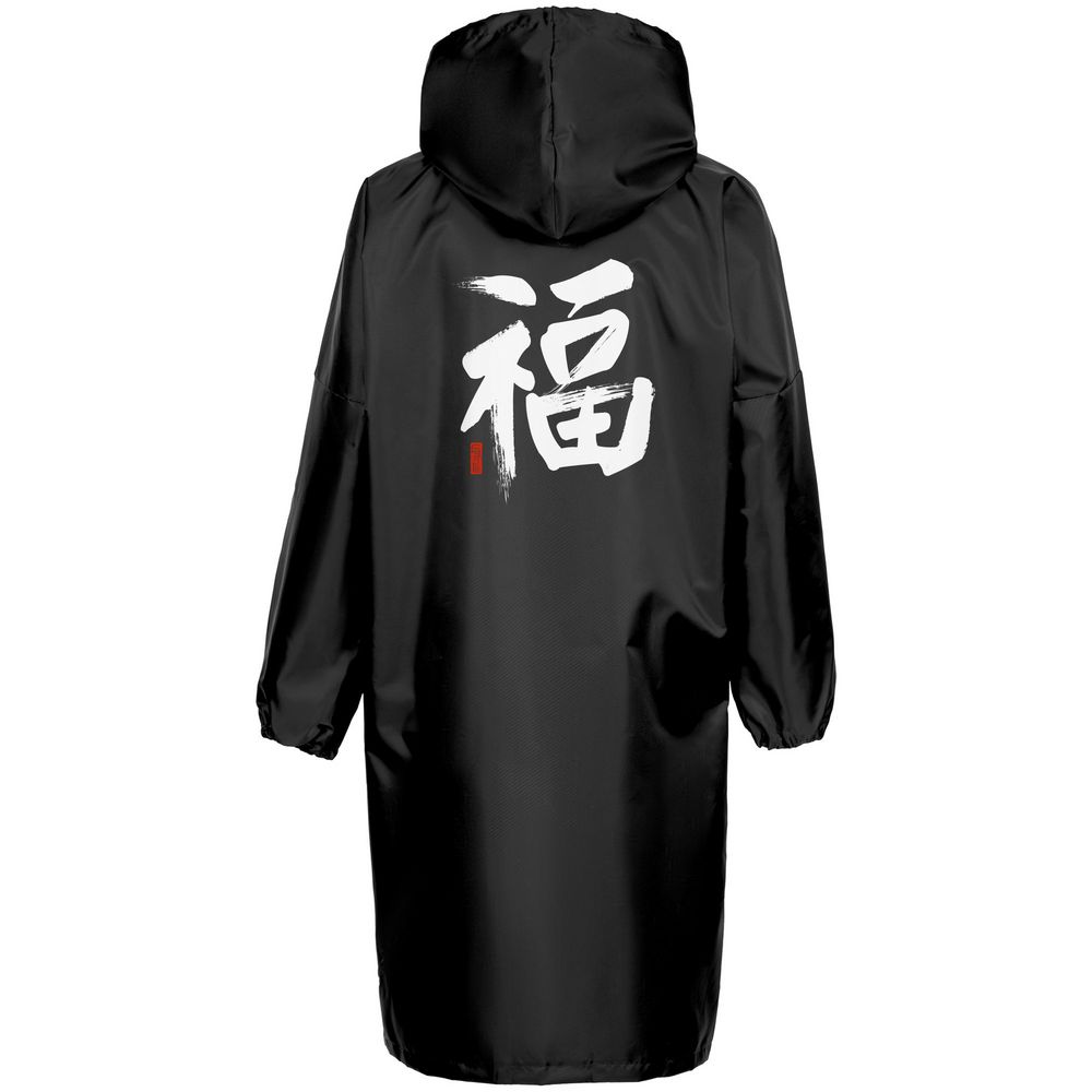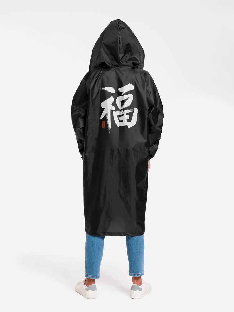 Иероглифы коллекции «Вечные ценности» выполнены в жанре каллиграфии на древнекитайском диалекте мандарин. Плавные линии символизируют внутренний баланс и фокусировку на главных жизненных ориентирах.Плащ-дождевик из ткани таффета на молнии с капюшоном. Складывается в мешочек — удобно брать с собой.