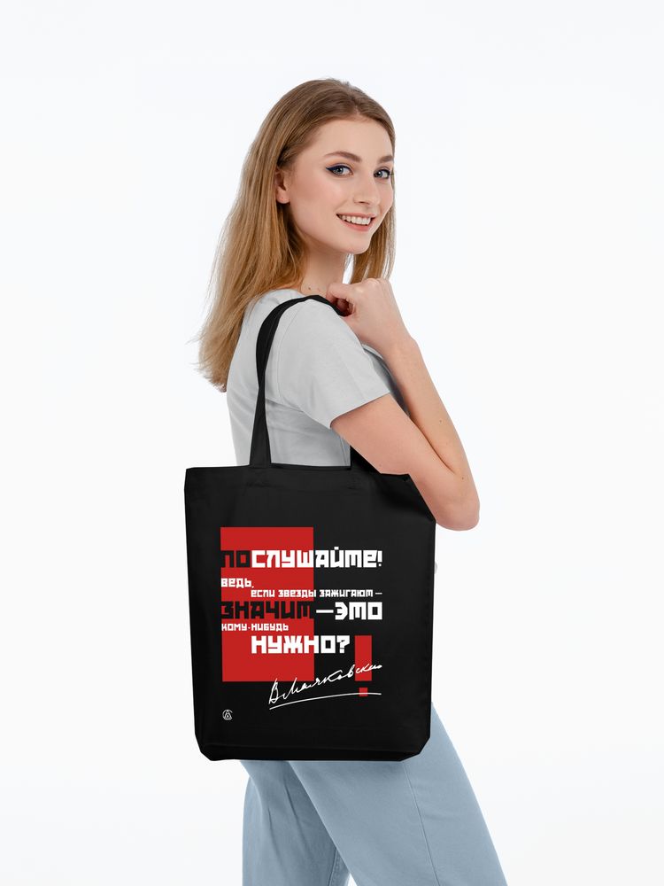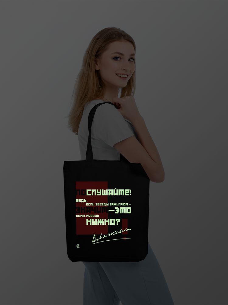 Холщовая сумка «Цитаты. Маяковский. Послушайте» со светящимся принтом, черная