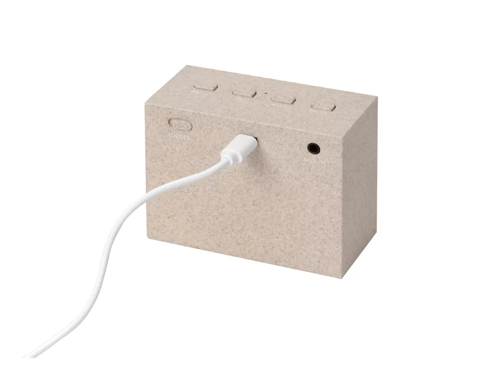 Беспроводная колонка Wheatty на 35% состоит из переработанной пшеничной соломы, что является положительным примером сокращения производства и потребления пластика в мире. Воспроизводит музыку в течение 3-х часов. Мощность 3 Вт. В колонке предусмотрены кнопки управления и линейный вход (AUX). Компактная колонка с быстрым подключением (Bluetooth 5.0). Поставляется в крафт упаковке из переработанной бумаги.