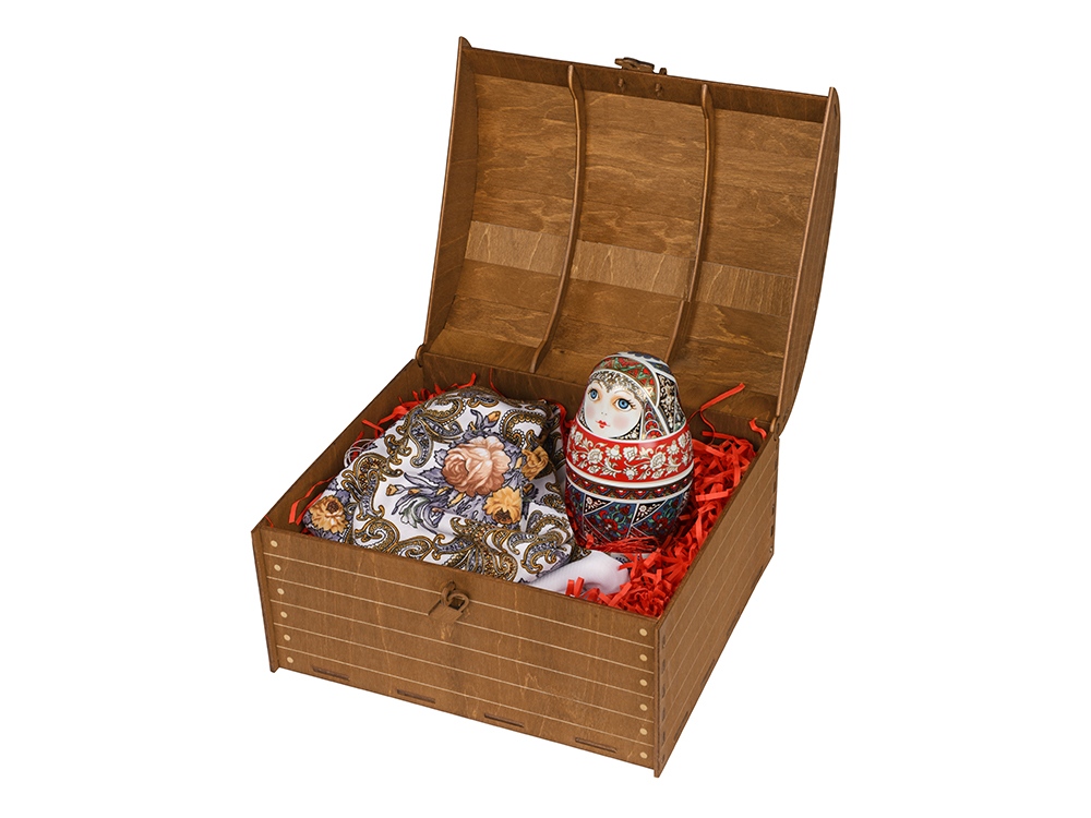 Подарочный набор Матрешка состоит из фарфоровой матрешки и платка, расписанного в русско-народном стиле. Платок выполнен из шерсти и вискозы. Набор поставляется в большой деревянной коробке с замочком – вам не нужно думать над упаковкой подарка. Такой сувенир – отличное решение для подарка руководителю или партнеру по бизнесу.