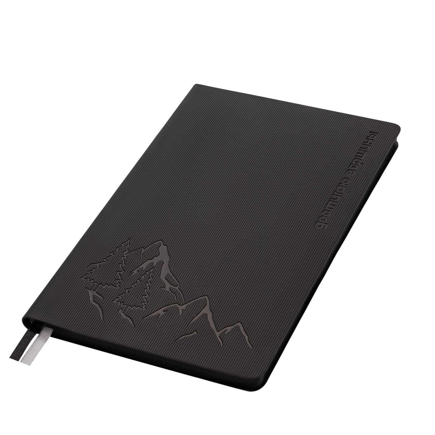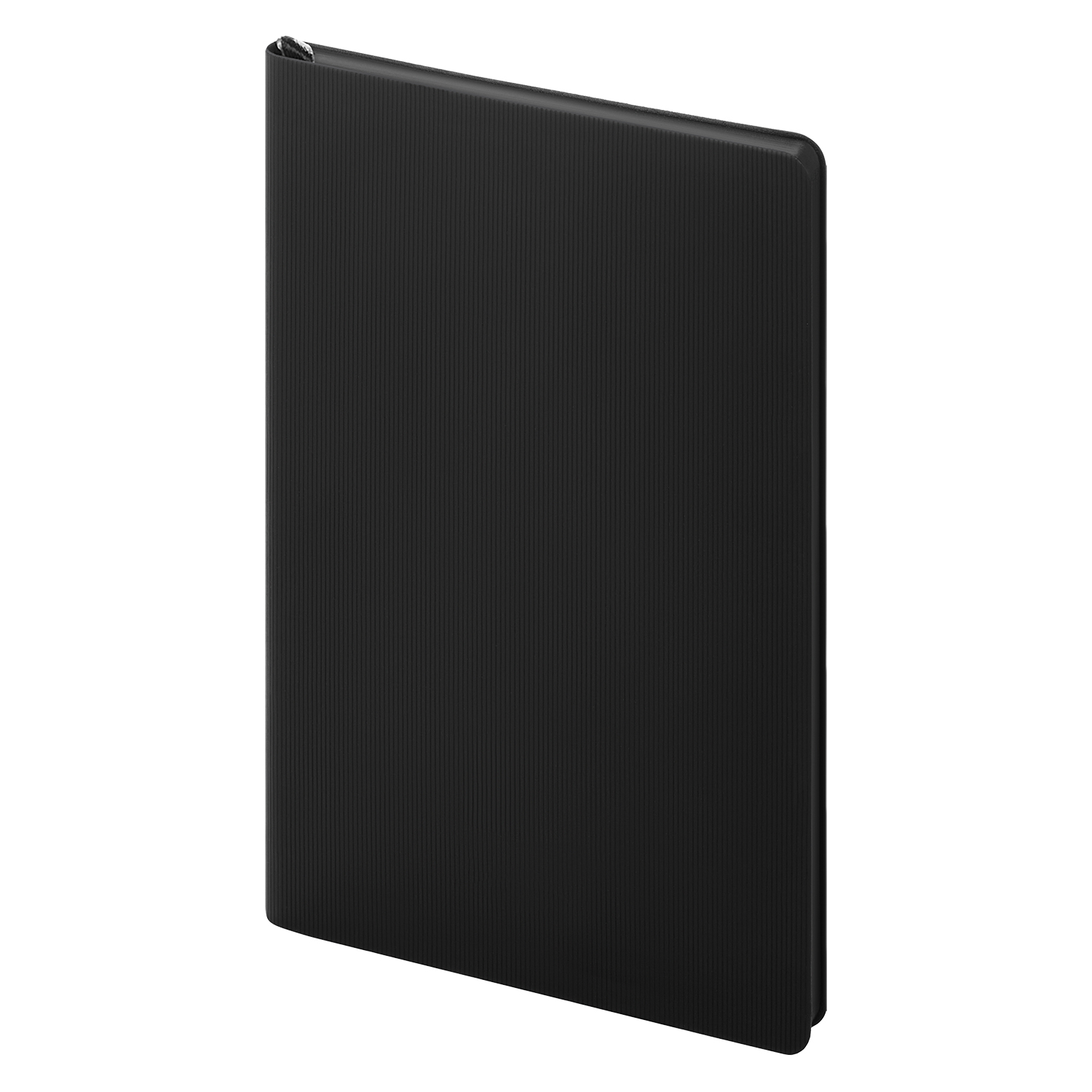 Недатированный ежедневник в строгой деловой лаконичной тональности. Современный технологичный дизайн, спокойные природные цвета. Гибкая матовая обложка со скругленными уголками выполнена из искусственной кожи, имитирующей покрытие в стиле Hi-Tech. Переплетный материал с вертикальным рифлением, бархатистый, со слегка прорезиненным эффектом. За счет интересной рельефной фактуры прослеживается игра цвета при перемене освещения. Цвет – классический черный, плотный, однородный. Создает органичный сдержанный тандем с матовыми форзацем и нахзацем серого цвета. Срез матовый, в тон обложки. Страницы со скругленными уголками приятного глазу теплого светло-кремового цвета. Выполнены из гладкого шелковистого офсета. Ежедневник дополнен двойным атласным ляссе из лент серого и черного цветов, имеющих глянцевый отлив.Без упаковки (без стикера)