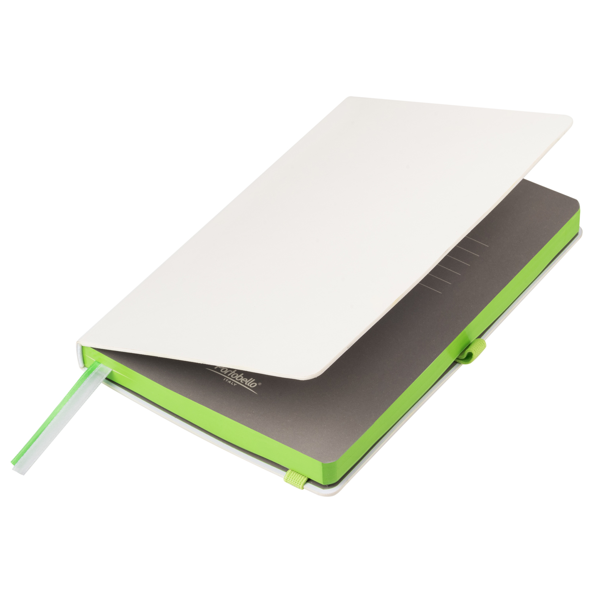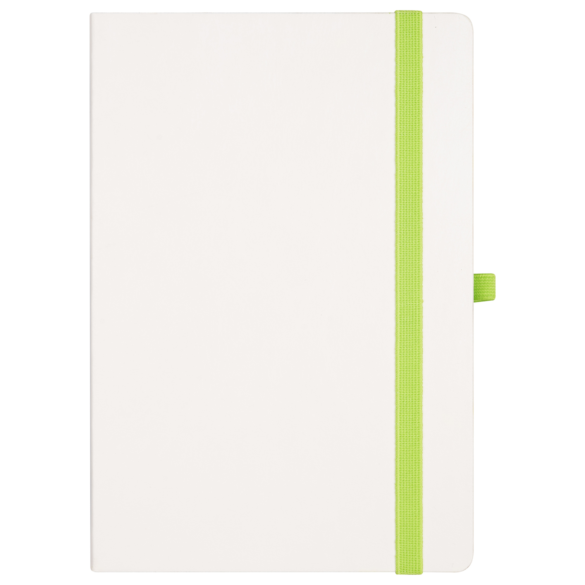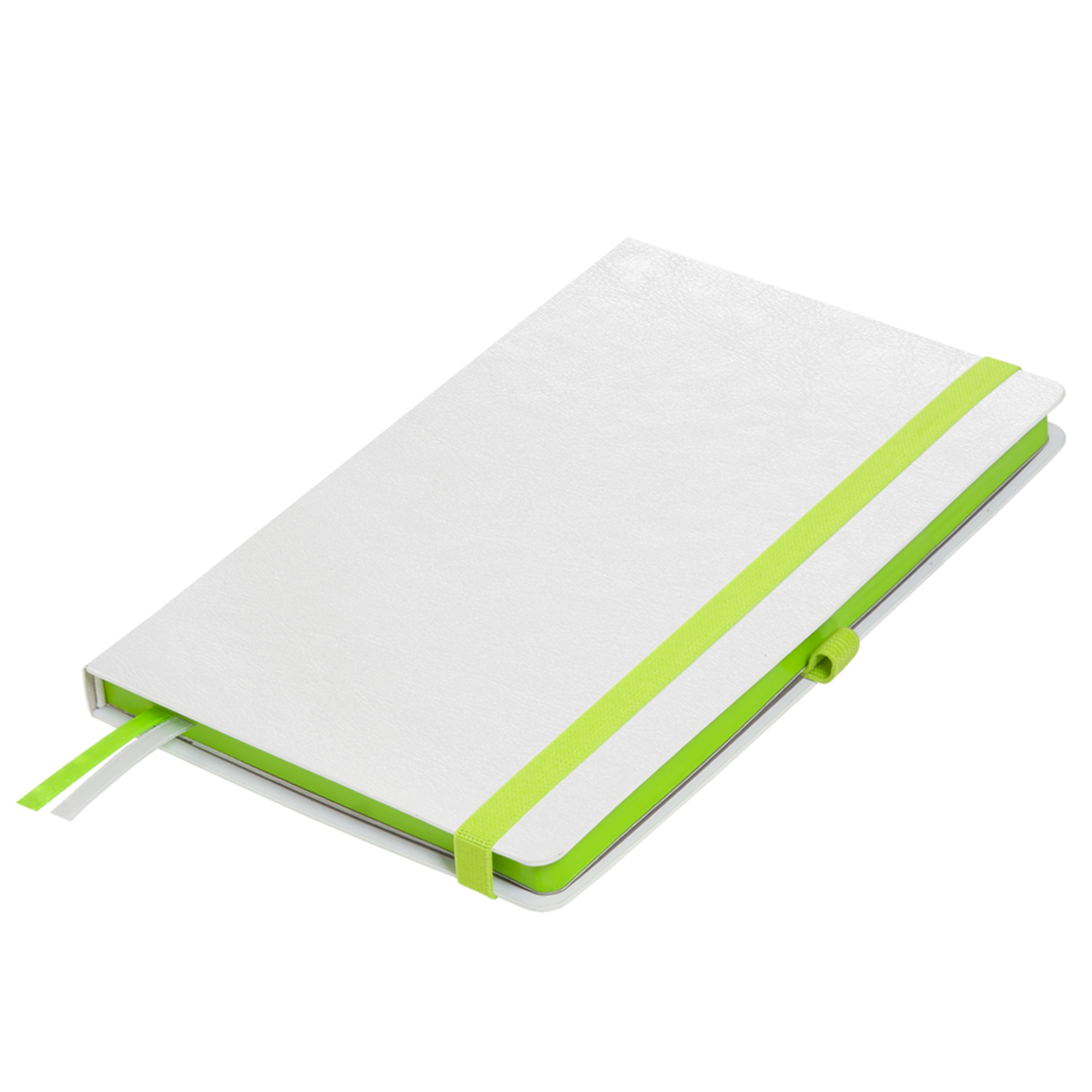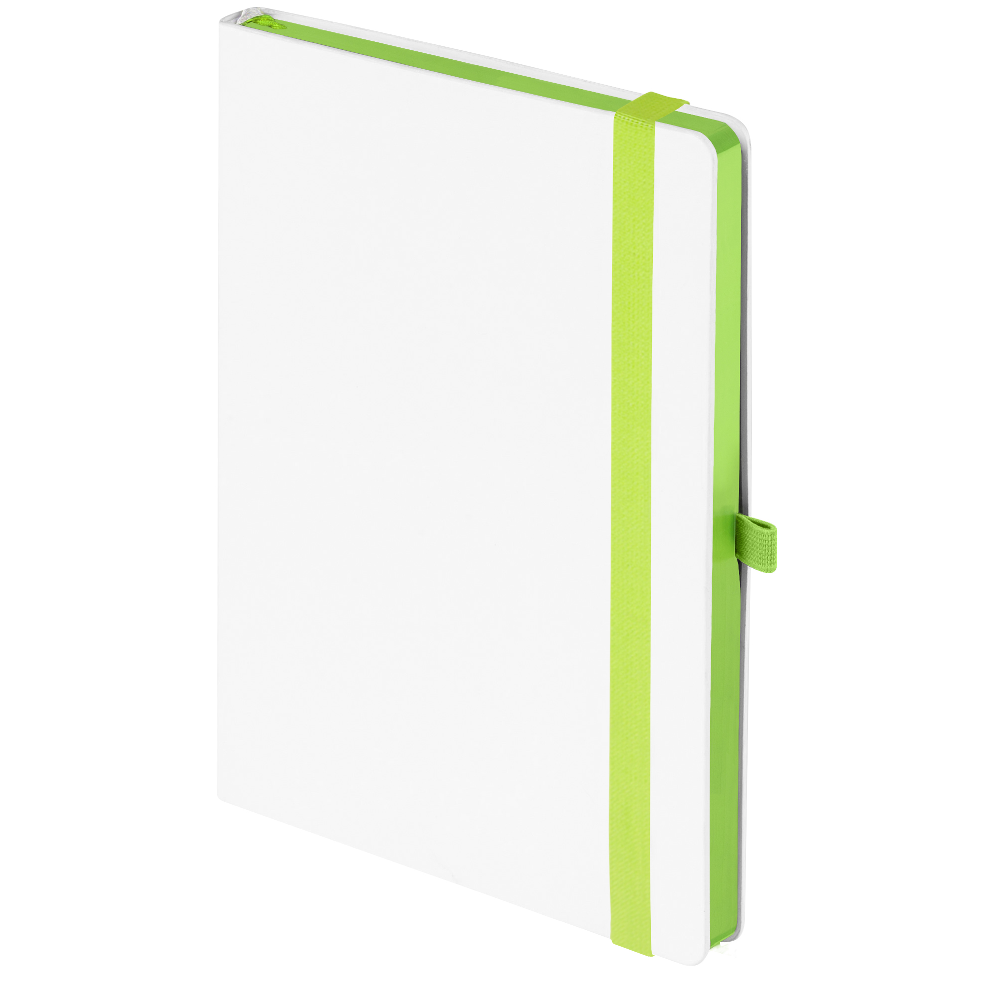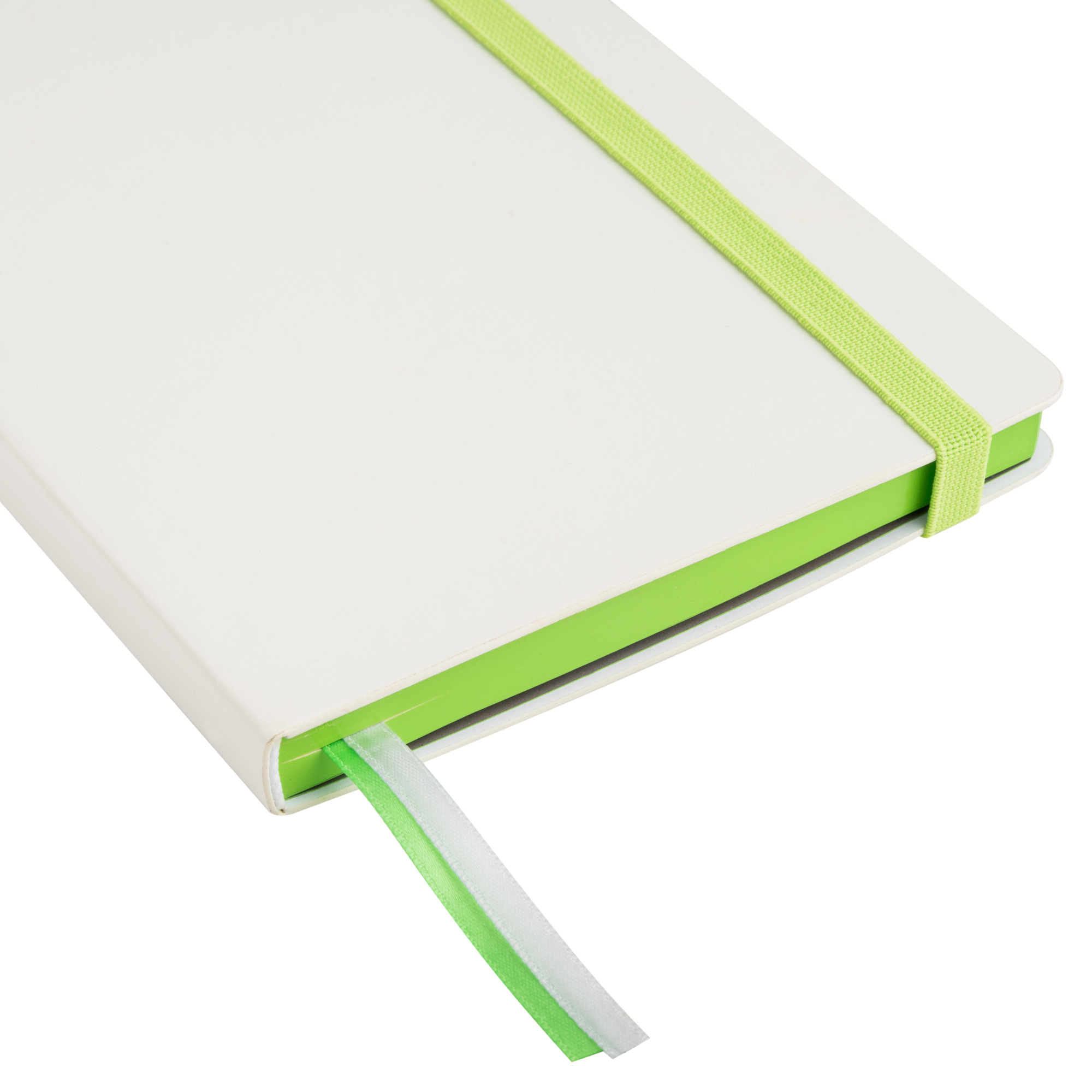 Бизнес-аксессуар выполнен в жесткой обложке из искусственной кожи со скругленными уголками. Переплетный материал гладкий, с легкой естественной паутинкой морщин, имеет полуглянцевый блеск. Цвет – чистый белый. Серые матовые форзац и нахзац, а также зеленый фольгированный срез с искрящимся металлическим блеском создают оригинальный динамичный цветовой ансамбль и подчеркивают белизну обложки. Страницы светло-кремового цвета, из гладкого офсета, слегка шелковистые, со скругленными уголками. Добавляют изделию мягкую комфортную теплоту. Двойное атласное ляссе составлено из серой и зеленой лент. Каждая шириной 6 мм, имеет легкий блеск. Вертикальная фиксирующая резинка прочная, надежная и удобная, светло-зеленого цвета. Есть петелька для ручки в тон резинки.Упаковка: пластиковая коробка - есть.