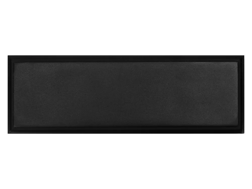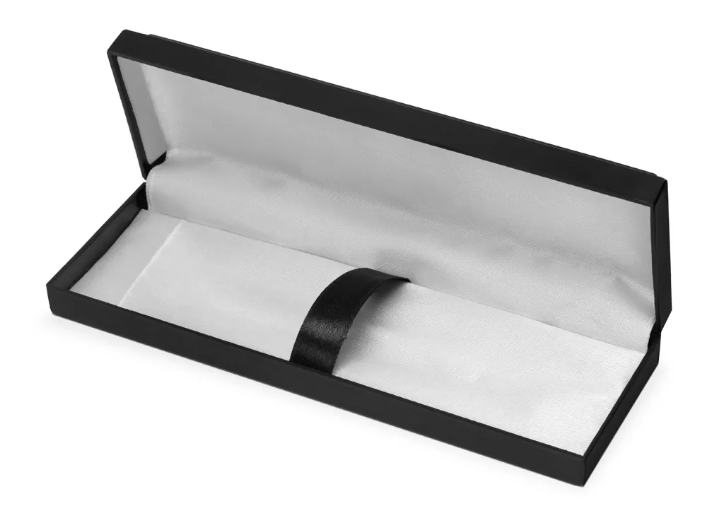 Изготовлен из черного пластика и белого атласного ложемента, пишущий инструмент закрепляется с помощью резинки прикрытой лентой.