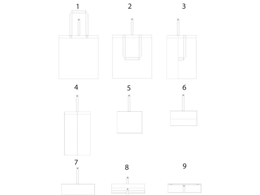 Эко-сумка с открытым основным отделением и цветными ручками, раскладывающаяся в высоту на 32 см. Имеет ремень с пуговичной застежкой, чтобы закрывать сумку. Прочность до 8 кг.