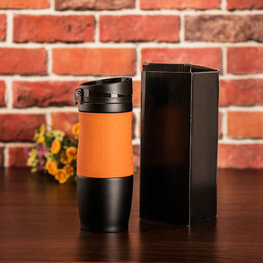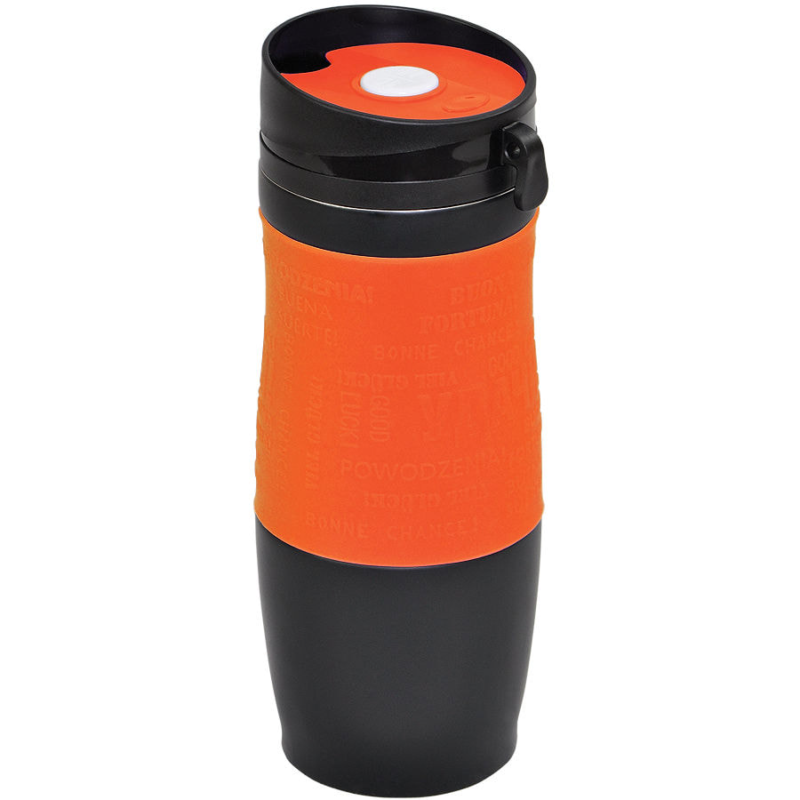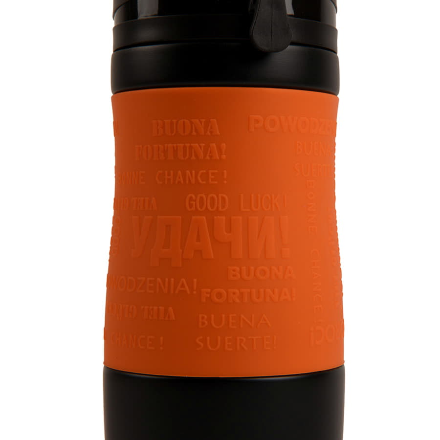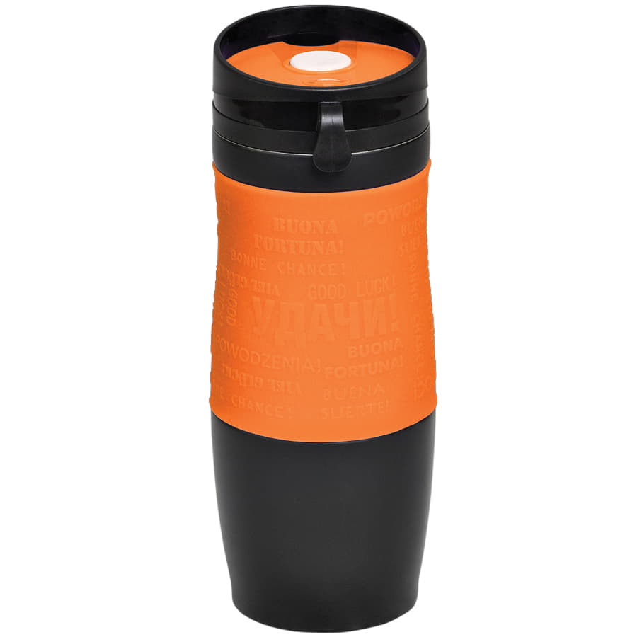 Удачи! Яркая термокружка с силиконовой манжетой. На манжете - пожелание"Удачи!" на разных языках. Pantone 165C. Термокружки сделаны из 304 нержавеющей стали. Вы сможете сохранять ваши напитки горячими до 6 часов и холодными до 12 часов.