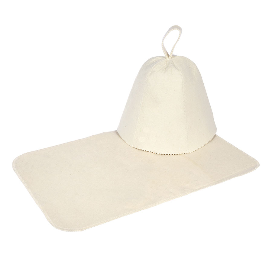 Классический набор для сауны из войлока. Каждая деталь имеет свое назначение и предполагает постоянное использование во время посещения бани и сауны. Коврик убережет от ожогов в сауне, шапочка предотвратит тепловой удар и не позволит высокой температуре и влажности испортить волосы.