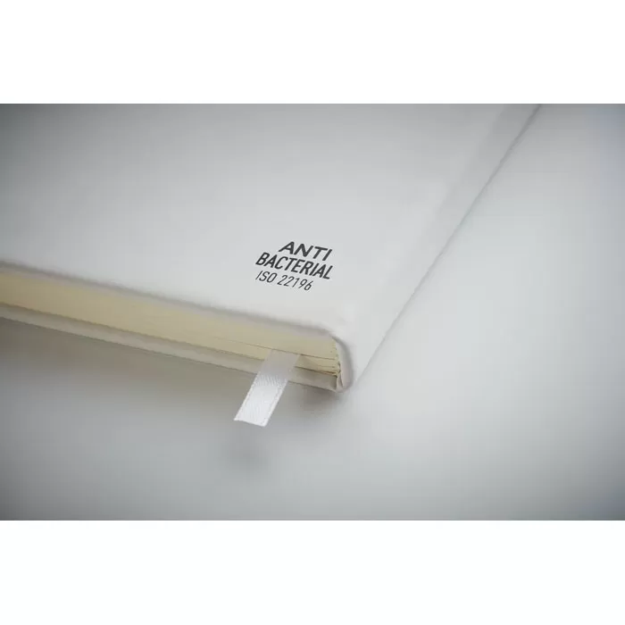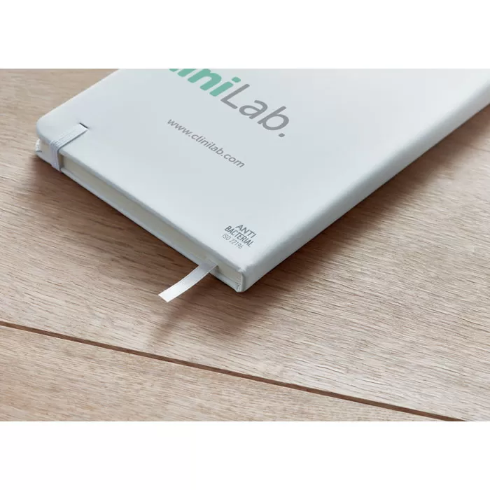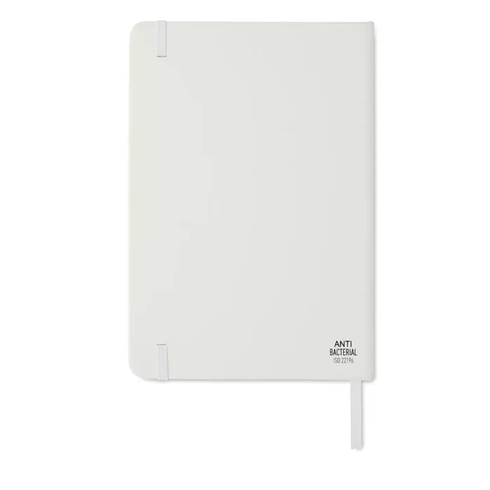 Блокнот формата A5 с мягкой антибактериальной обложкой из полиуретана и 96 линованными страницами (70 гр.) на резинке. ISO 22196. Антибак покрытие обеспечивается серебряным напылением, т.н. нано-сильвер покрытие.