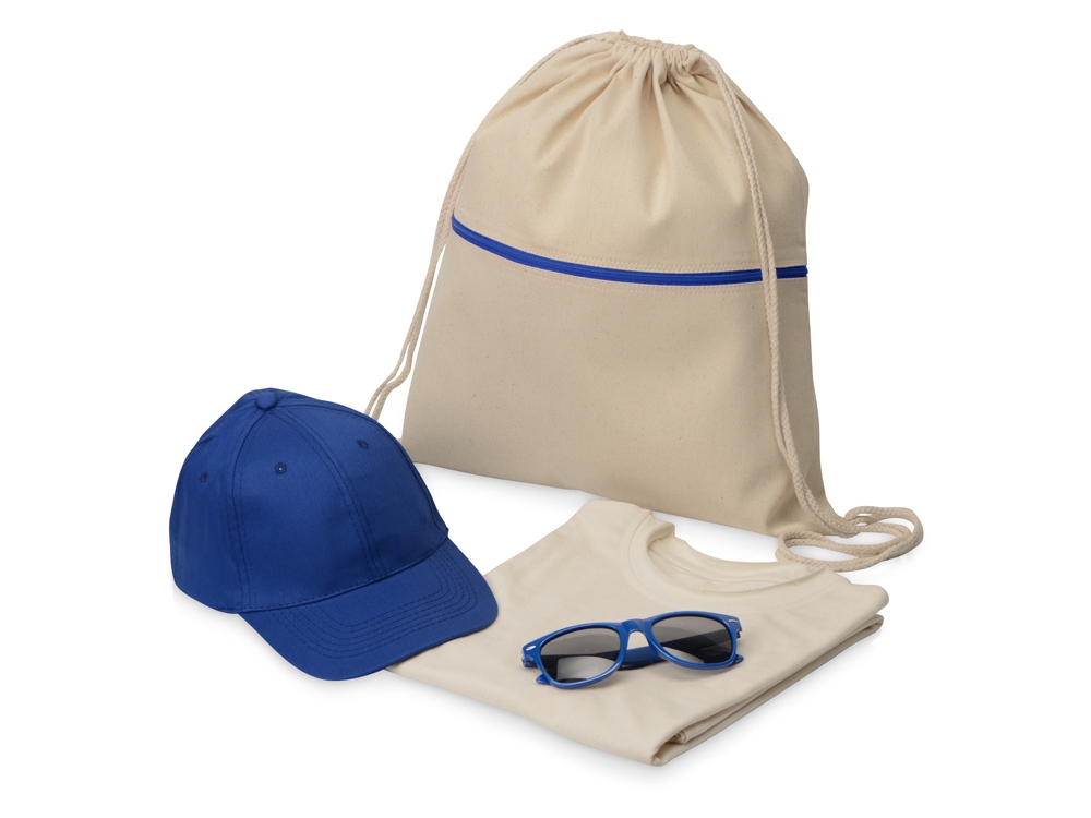 | Цвет | рюкзак- натуральный/синий, футболка- натуральный, бейсболка- синий, очки- синий |