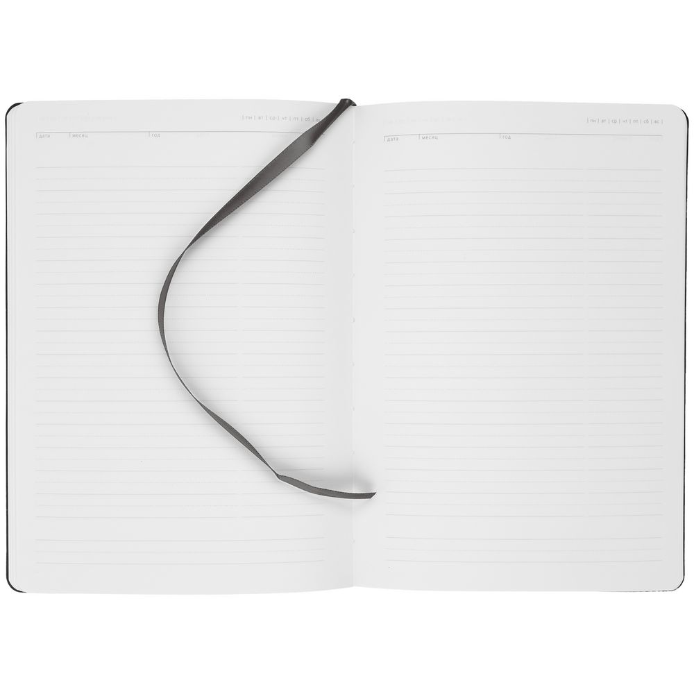 Ежедневник с гибкой обложкой, выполнен из материала Latte, темно-серый, дополнен ляссе в цвет обложки.