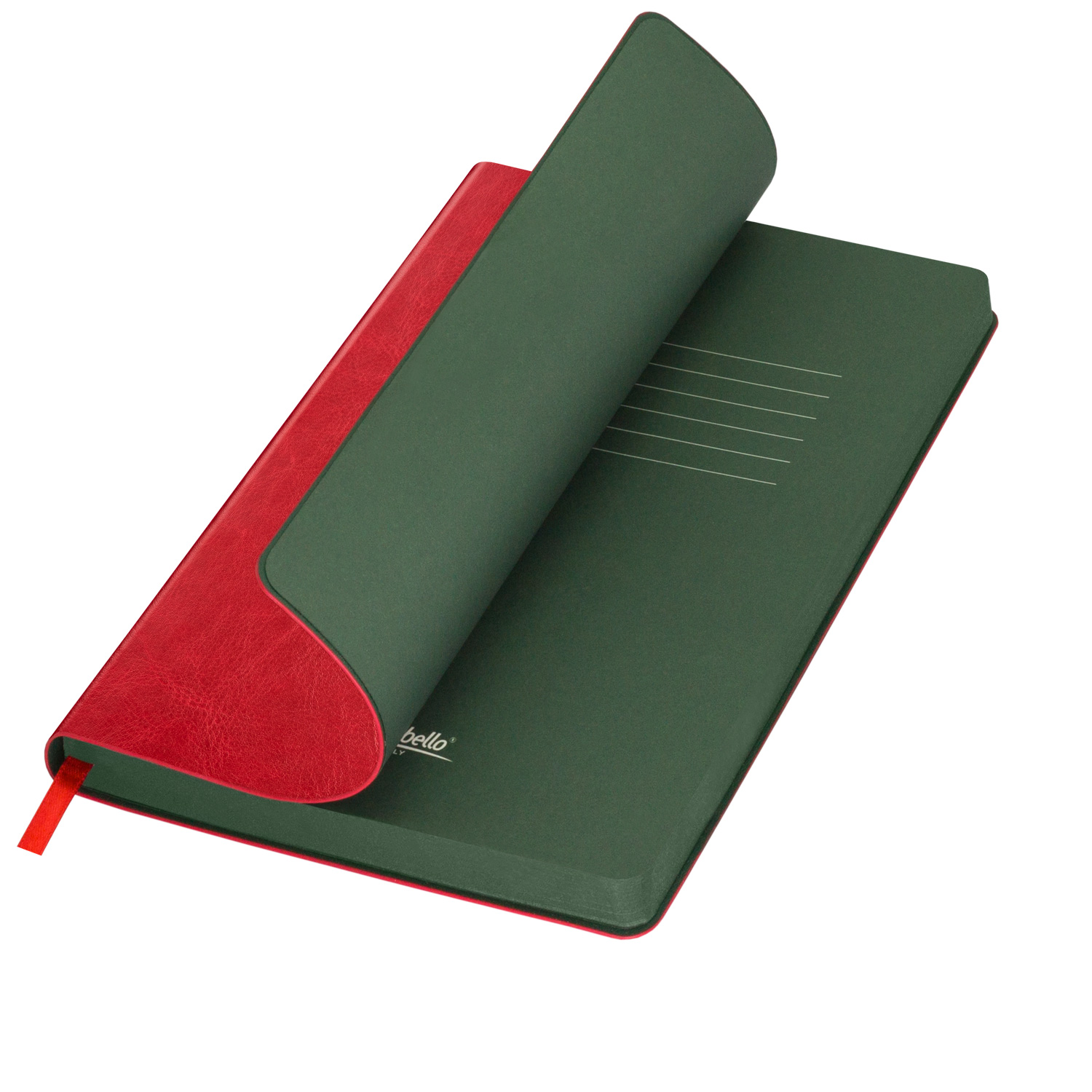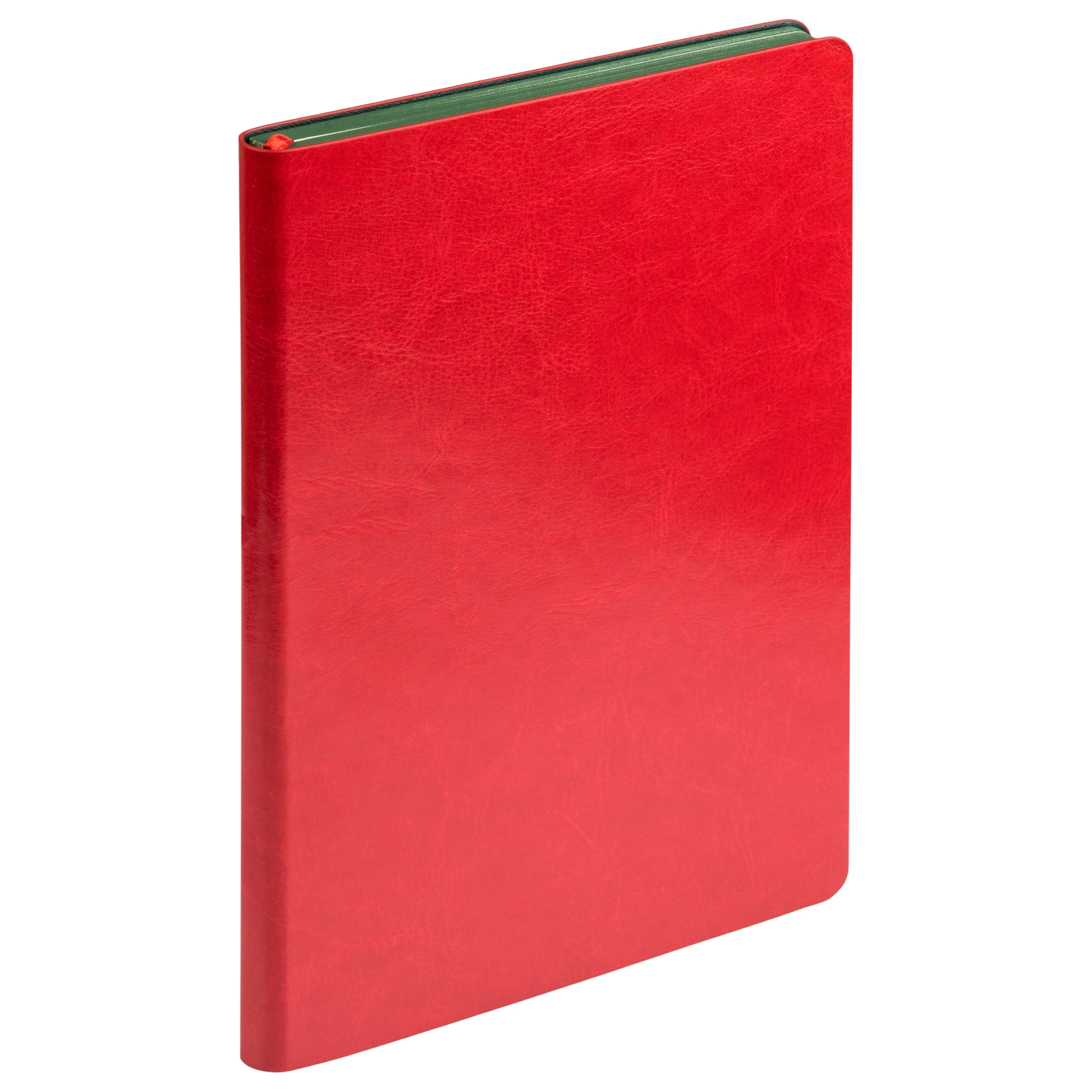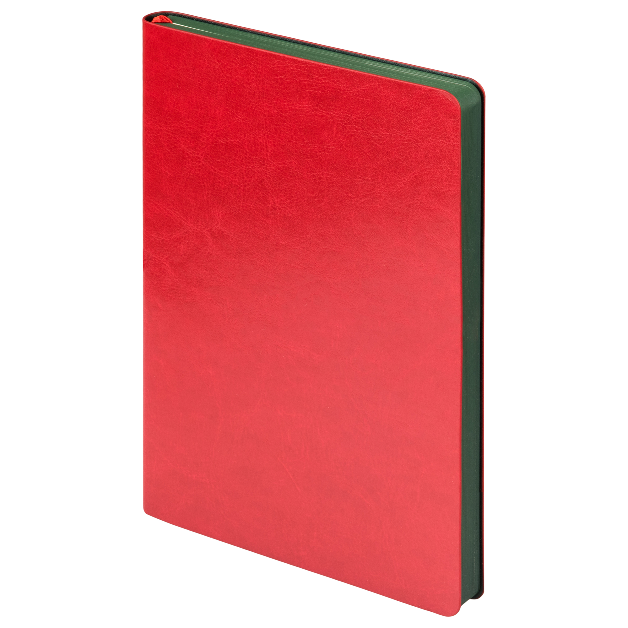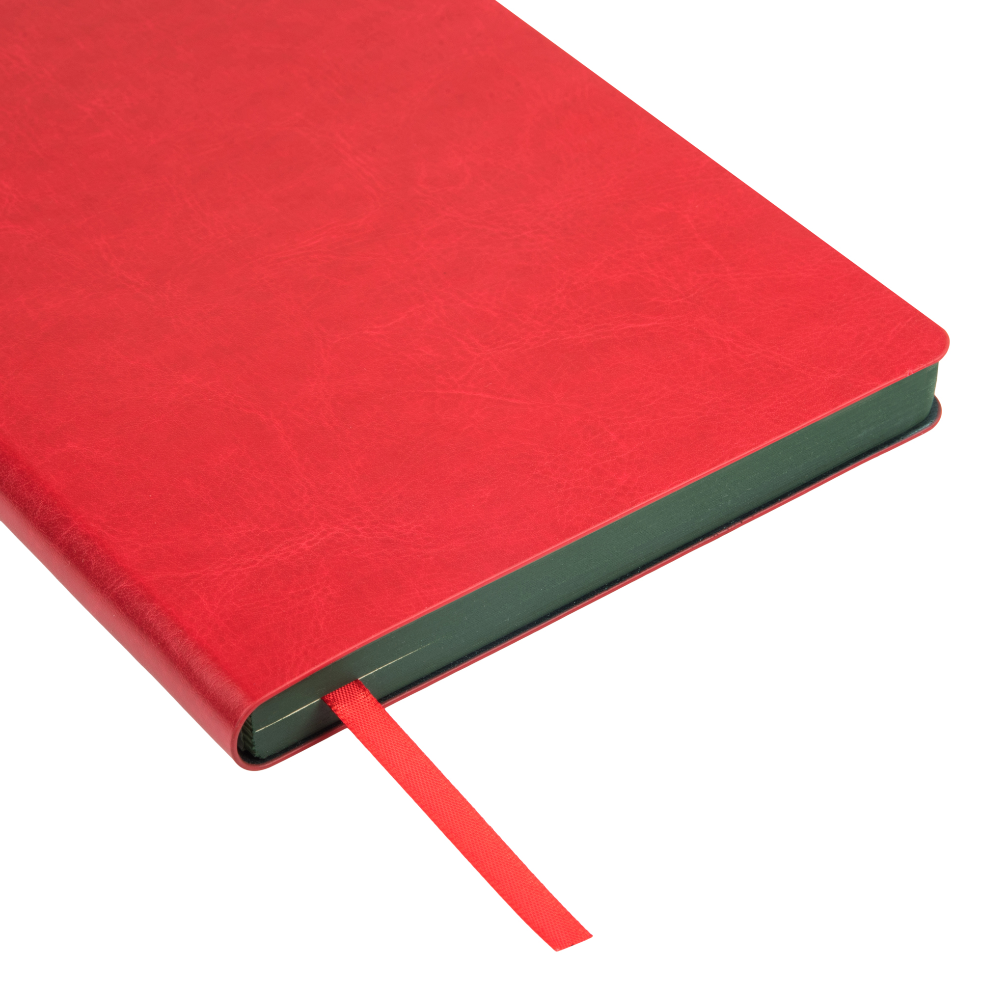 Недатированный ежедневник в необычном цветовом решении. Отличается современным дизайном и отличной функциональностью. Выполнен в гибкой обложке со скругленными уголками из искусственной кожи с эффектом «венецианской штукатурки». На ощупь поверхность гладкая, глянцевая, фактурно ощущается характерный для кожи мелкий рельеф. Не образует заломов, не расслаивается. Цвет обложки – насыщенный красный, однородный, комфортный глазу. Тон за счет фактуры может меняться в зависимости от освещения. Цвет матовых форзаца и нахзаца – темно-зеленый, приглушенный, природный. Красиво необычно контрастирует с обложкой. Срез матовый, выполнен в тон форзаца и нахзаца. Страницы со скругленными уголками теплого светло-кремового оттенка из гладкого шелковистого офсета. Одинарное атласное красное ляссе с легким глянцевым отливом. Ширина ляссе 6 мм.