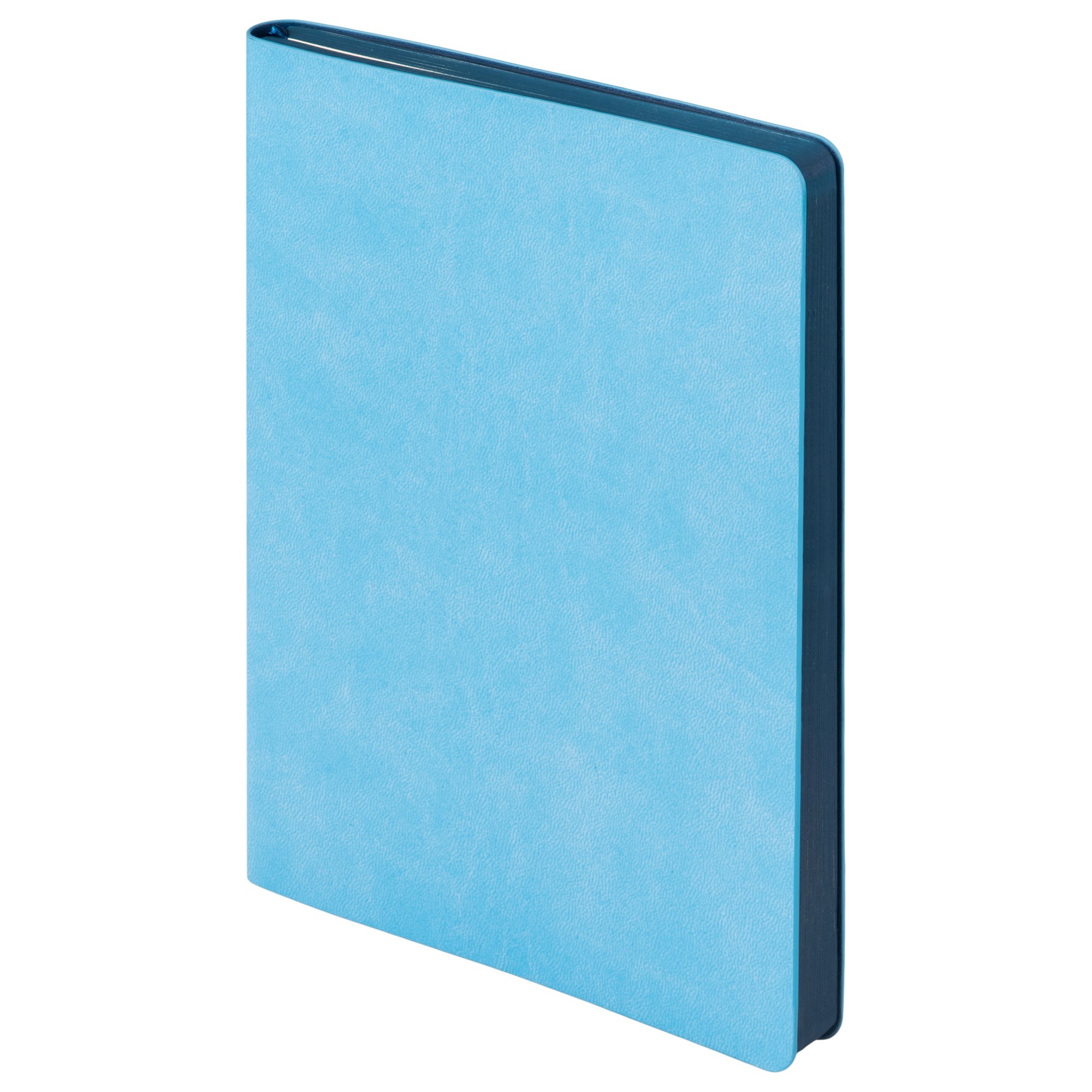 Яркий и выразительный дизайн ежедневника Latte New не может остаться незамеченным. Минималистичный, но завершенный внешний вид аксессуара обусловлен удачным сочетанием оттенков синего. Гибкая обложка с закругленными уголками выполнена из приятного на ощупь, слегка прорезиненного материала. Она не образует заломов, не расслаивается и устойчива к повреждениям. Покрытие обложки имеет едва заметный блеск и мелкозернистый рисунок, имитирующий искусственную кожу. Яркий внешний вид создается контрастными элементами: яркий и свежий голубой цвет обложки сочетается с глубоким синим цветом форзаца и среза. Форзац, нахзац и срез матовые. Кремовые скругленные страницы выполнены из шелковистого офсета. Они гармонично оттеняют свежесть основных цветов, уравновешивая цветовую композицию. Гладкое атласное синие ляссе с легким отливом выполнено в тон форзаца.