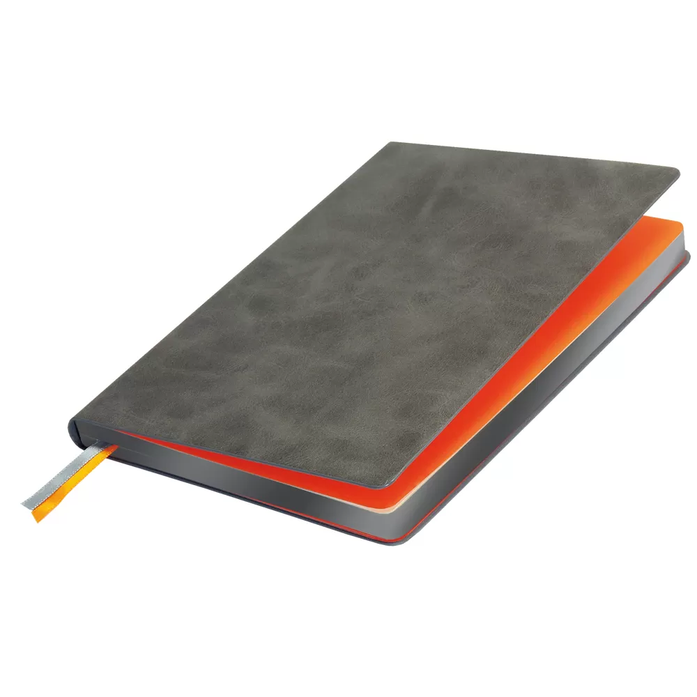 Ежедневник Atlas - единение элегантности и стиля. Аксессуар, выполненный в контрастных цветах, смотрится стильно и самодостаточно. Смелый и насыщенный апельсиновый оттенок форзаца и нахзаца дополняется классическим серым цветом обложки, который уравновешивает общую композицию. Фольгированный срез в тон обложке имеет переливчатый металлический блеск, гармонично сочетающийся с фактурой обложки. На умеренно-глянцевой поверхности ежедневника прослеживается едва заметный рисунок, вид которых создает эффект натуральной кожи. Это также подчеркивается мягкими переходами тона от темного к более светлому. Светлый кремовый цвет страниц из гладкого, чуть шелковистого офсета приятно согласуется с основным цветовым решением. Успешно завершает внешний вид аксессуара двойное атласное ляссе из оранжевой и серой лент шириной 6 мм.