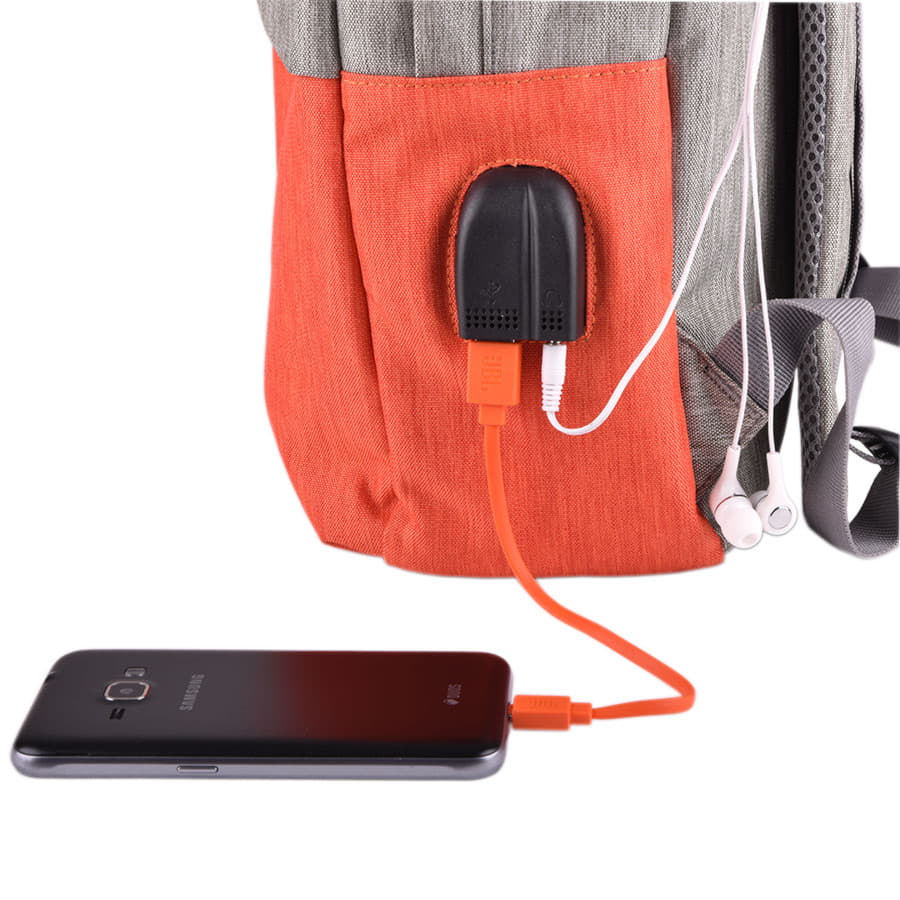 · USB разъем для подзарядки вашего устройства (внутри рюкзака в специальном кармане на молнии расположены кабель для соединения с power bank и провод с разъемом мини-джек 3,5 мм для наушников)