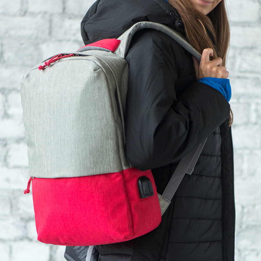 · USB разъем для подзарядки вашего устройства (внутри рюкзака в специальном кармане на молнии расположены кабель для соединения с power bank и провод с разъемом мини-джек 3,5 мм для наушников)
