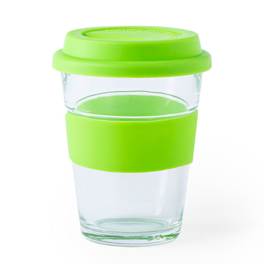 Стеклянный стакан с цветной силиконовой крышкой и манжетой.