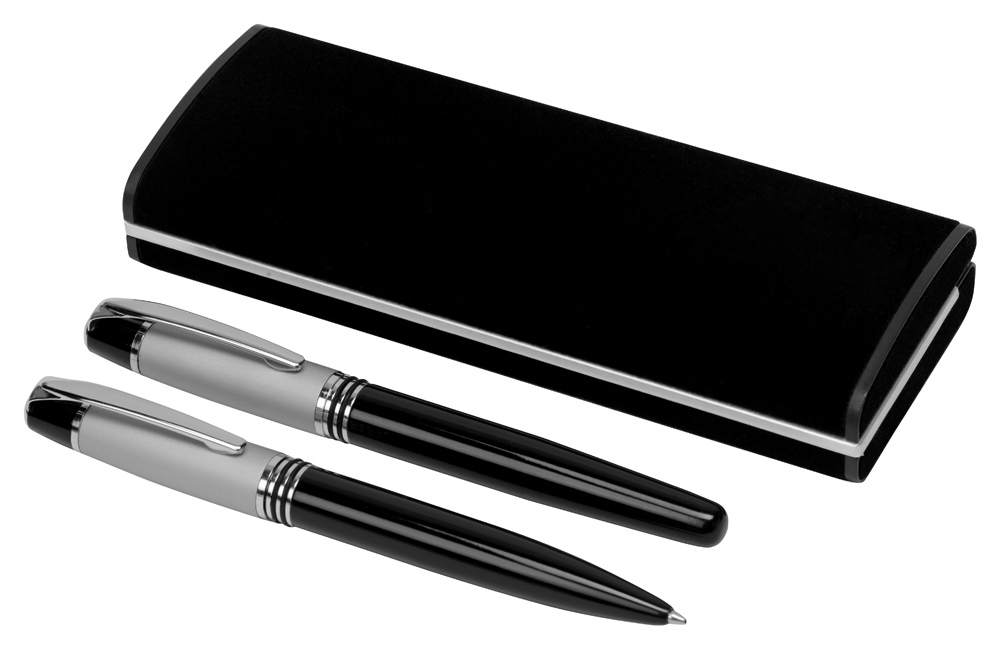 Стильный деловой набор в лаконичном черном футляре – идеальный по своей практичности сувенир. В набор входит шариковая ручка с поворотным механизмом и ручка-роллер с колпачком.