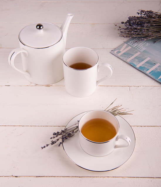 Чайный набор состоит из чайника и чайной пары, декорированы серебряным кантом. Все предметы изготовлены из костяного фарфора. Это разновидность материала, в котором, помимо основных компонентов, содержится примесь обожженной костяной муки. Такая посуда обладает тонкими стенками и значительно легче, чем аналогичные модели, но не уступает им по прочности. Весь набор отличается элегантной фактурой и идеально белым цветом.