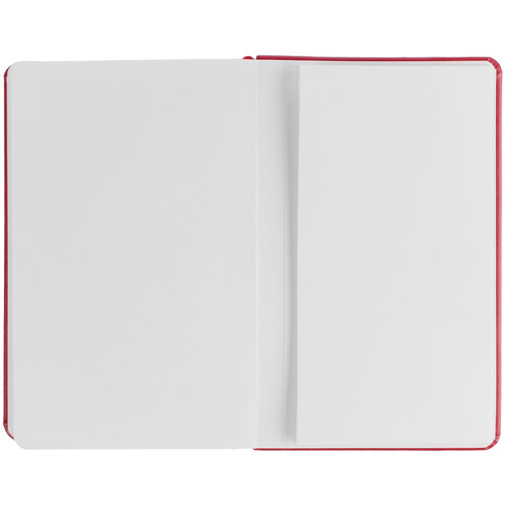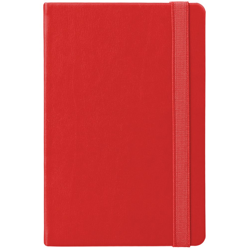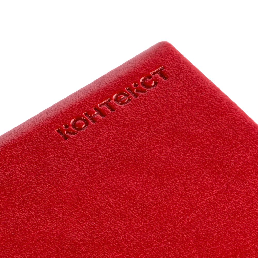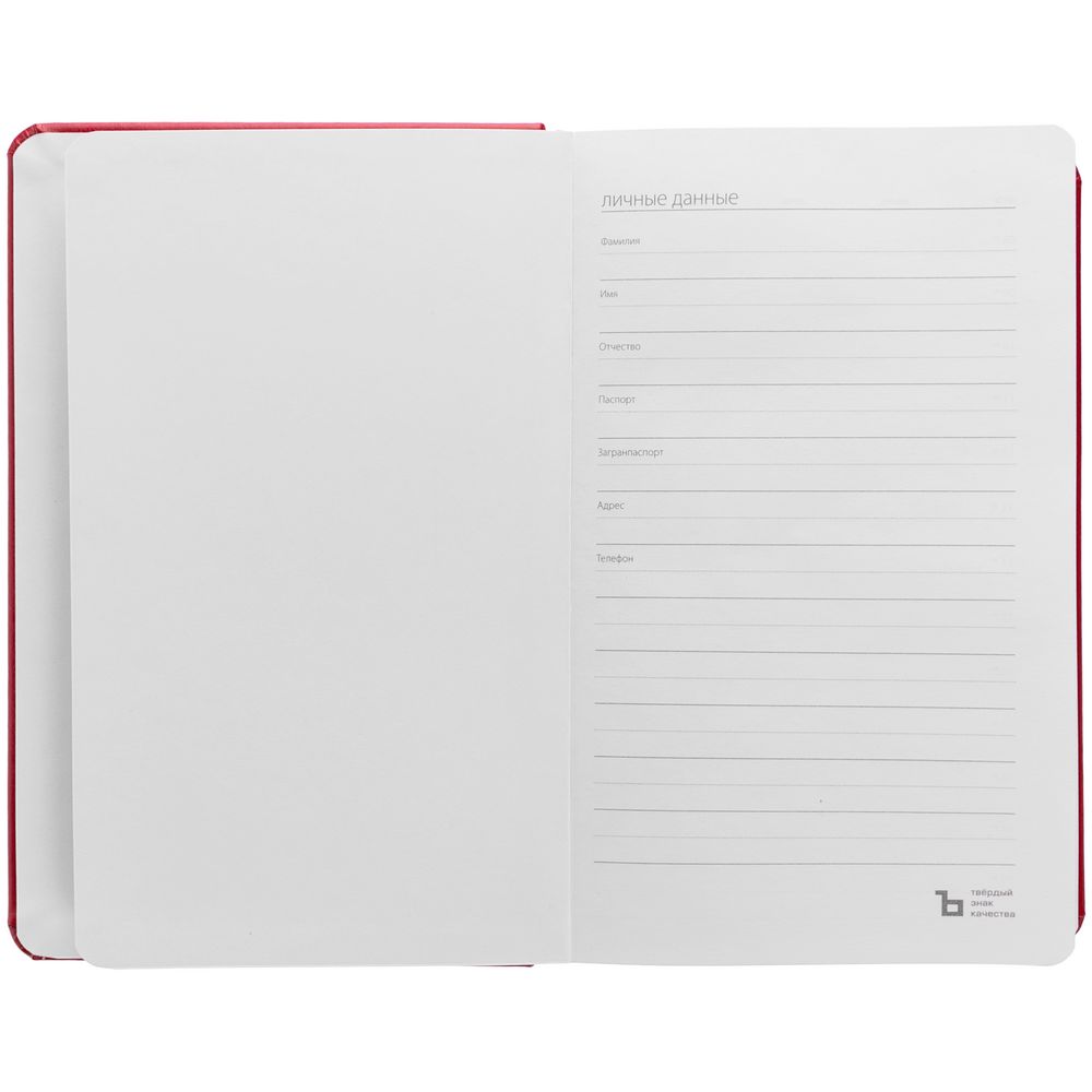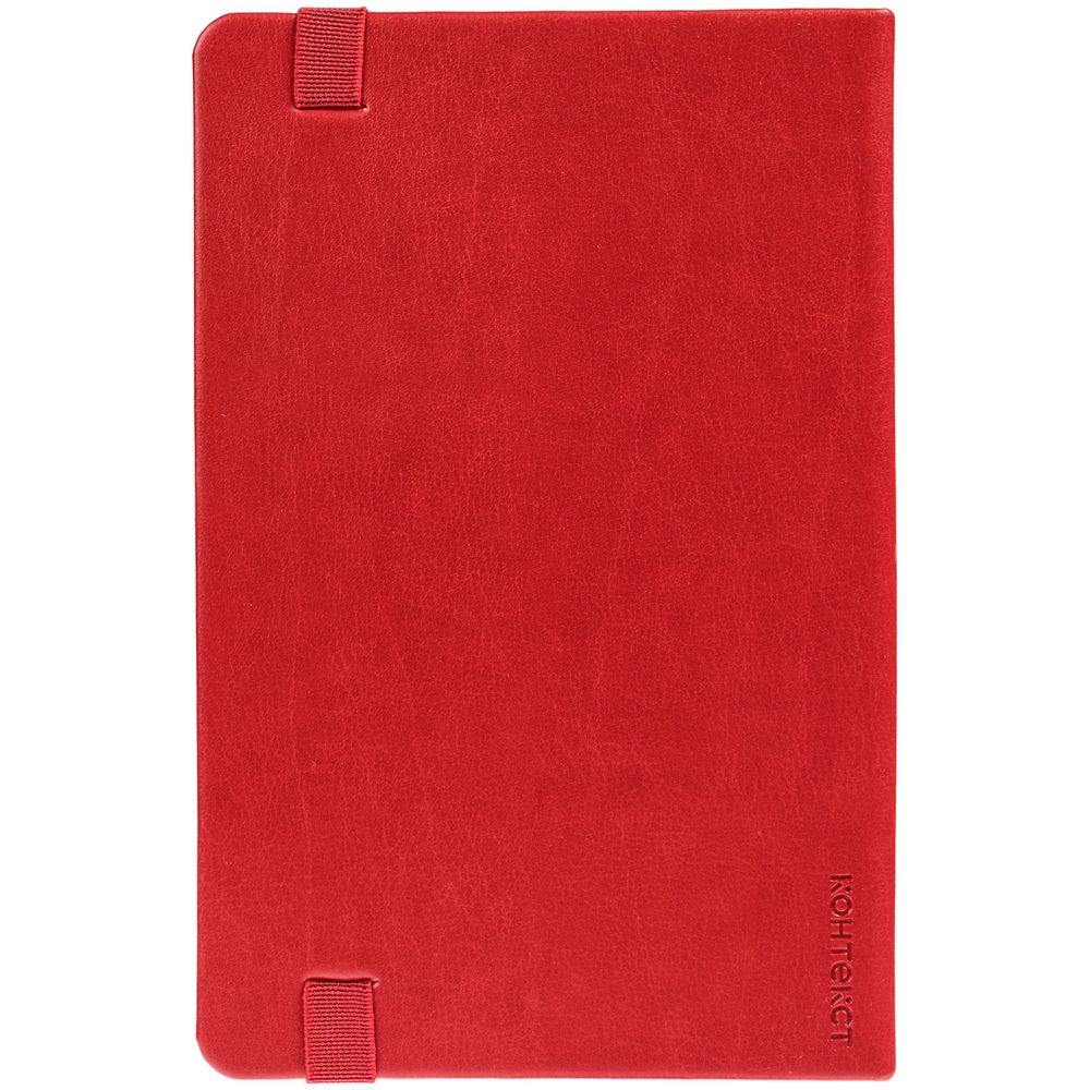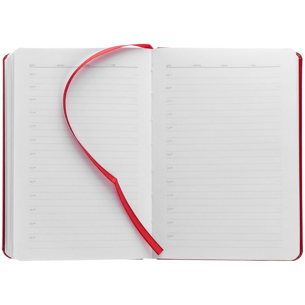 Ежедневник с твердой обложкой, выполнен из материала Replica, красный РР, дополнен резинкой и ляссе в цвет обложки.