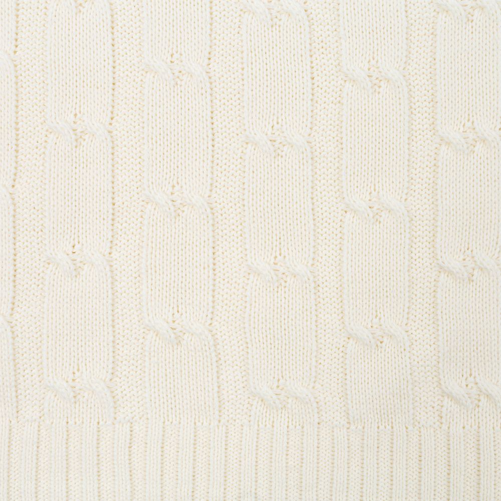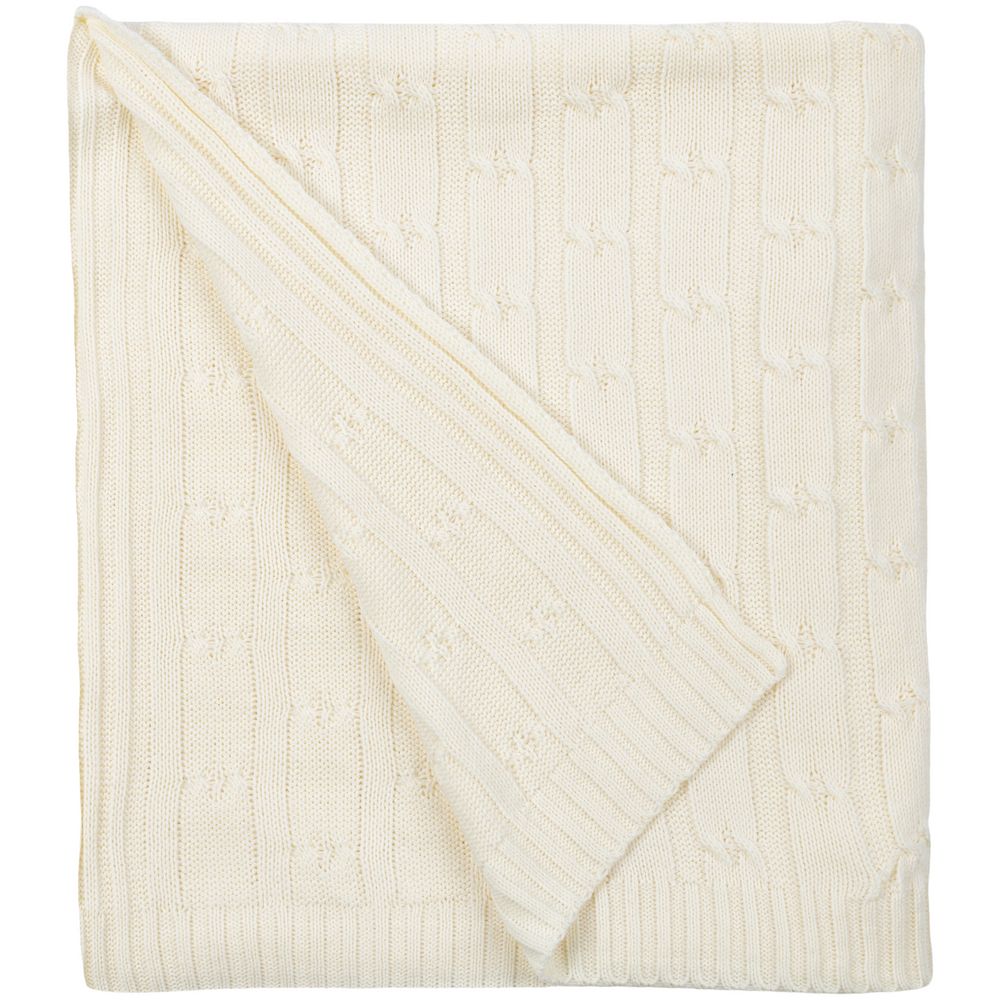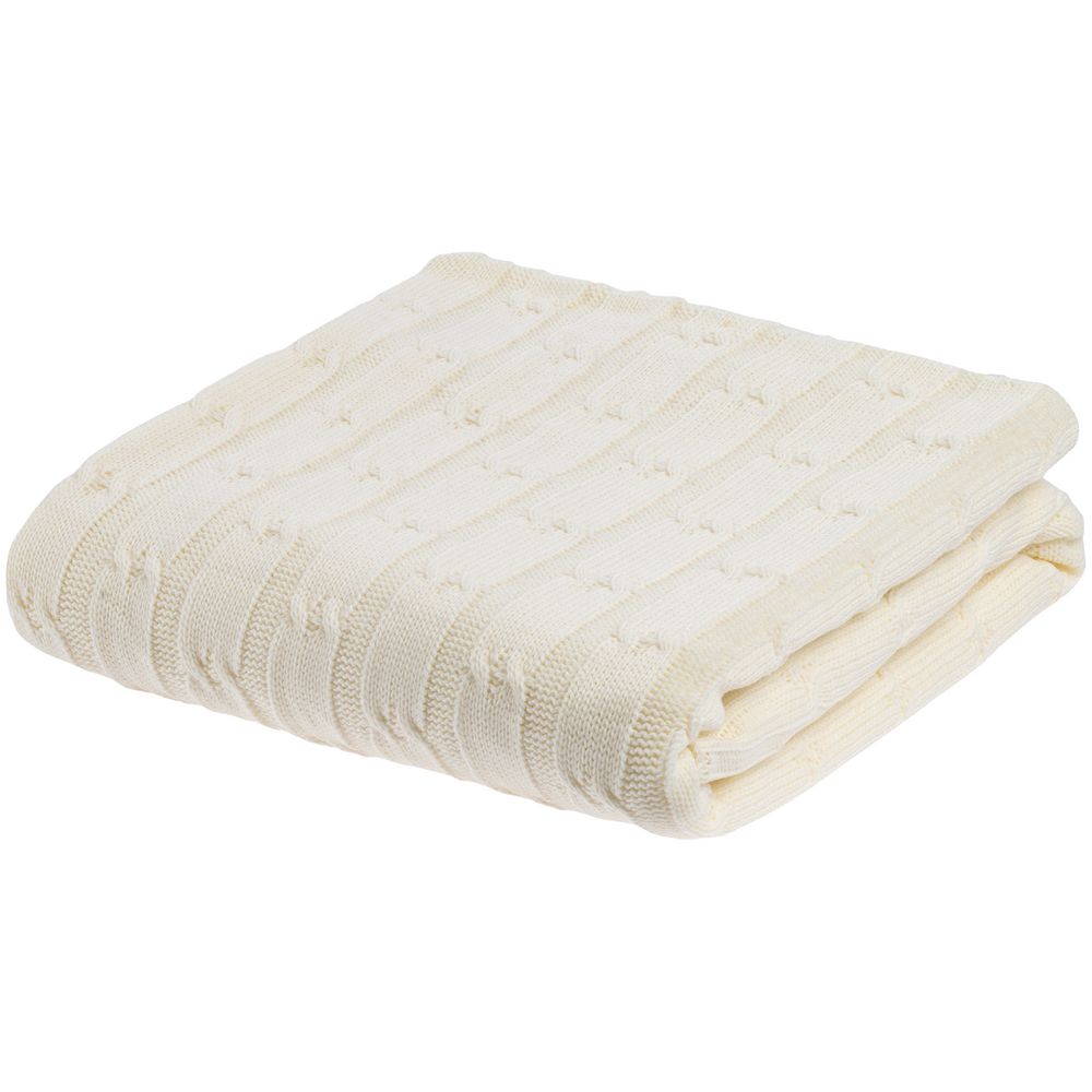 Модель: однотонный плед с фактурной вязкой, которая позволяет сделать его воздушным и объемным. Чередуя различные типы петель на гладком полотне, можно вывязать любую графику — логотип, текст, товарный знак.