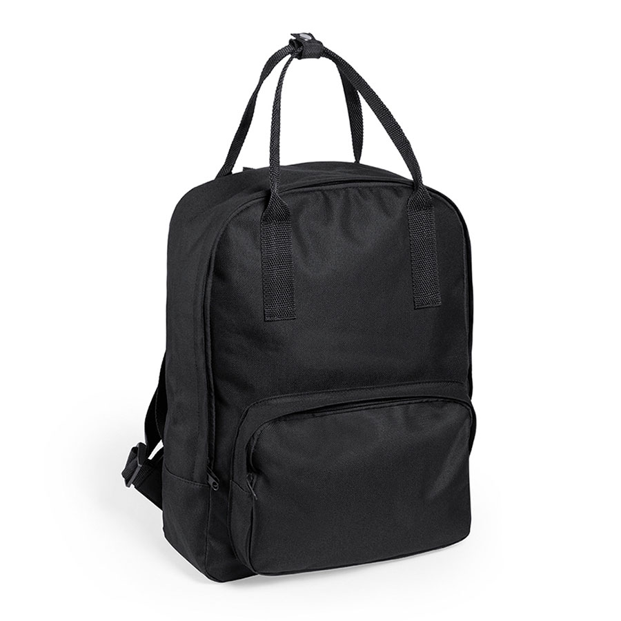 Рюкзак из полиэстера 600D с прочными ручками соответствующего цвета, застежкой-молнией и передним карманом.