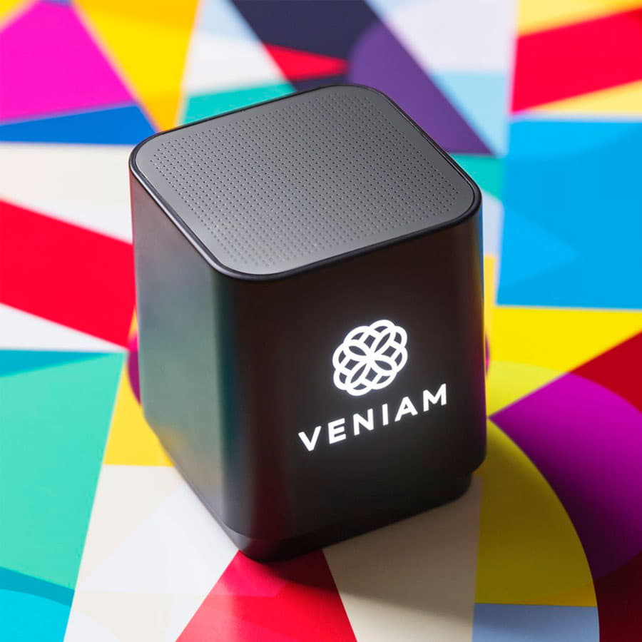 Колонка, на которой будет подсвечен отгравированный логотип, точно будет заметна на рабочем столе или в конференц-зале.