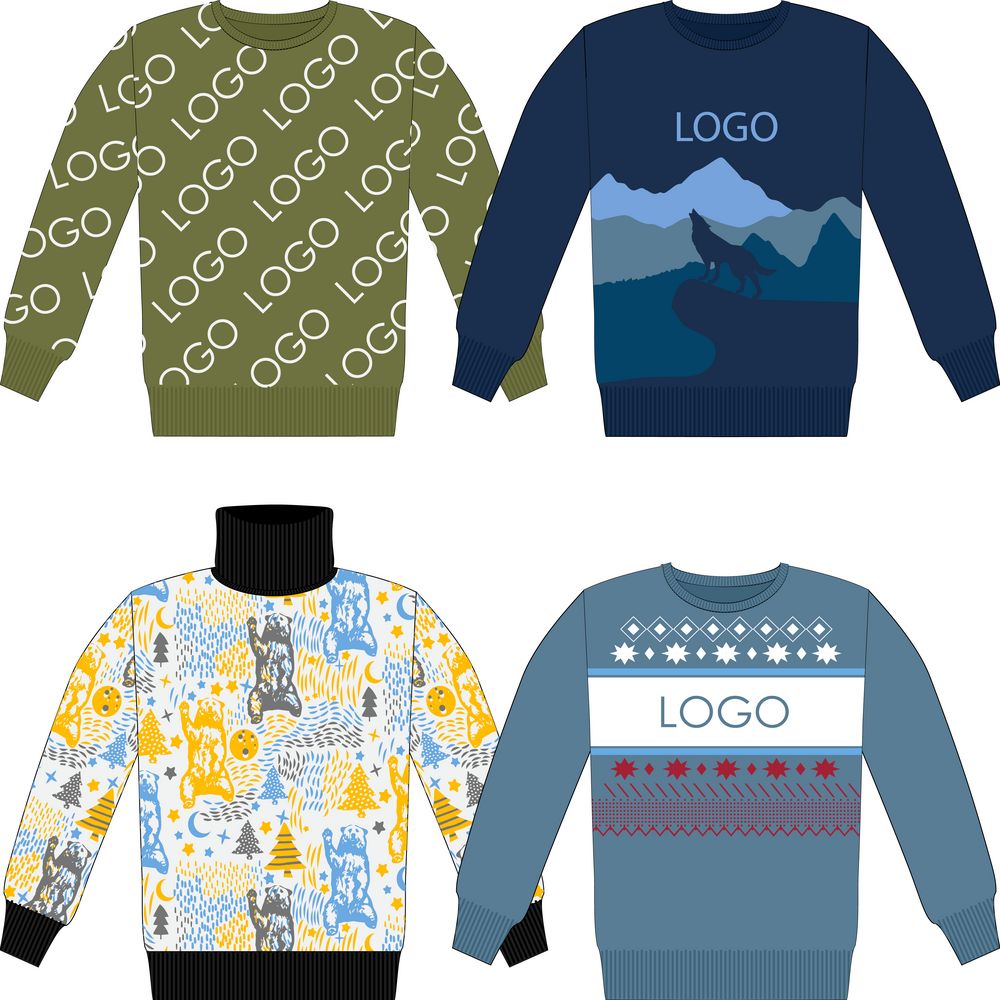 Свитер с вывязанным логотипом и индивидуальным рисунком в фирменной цветовой гамме.