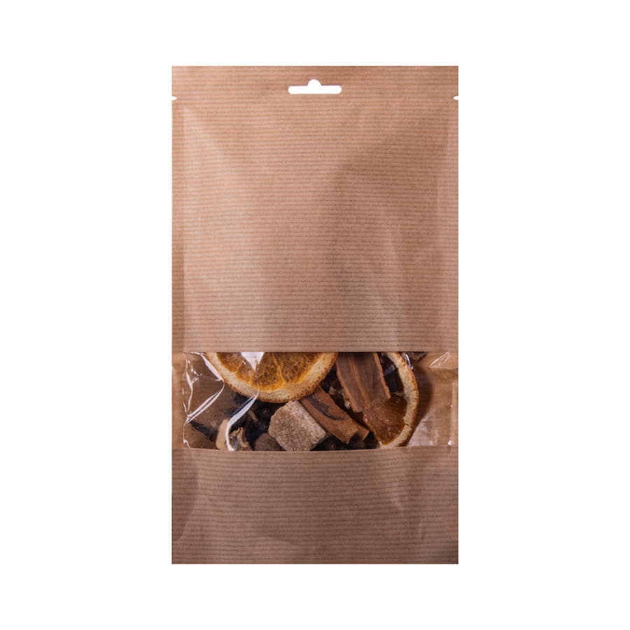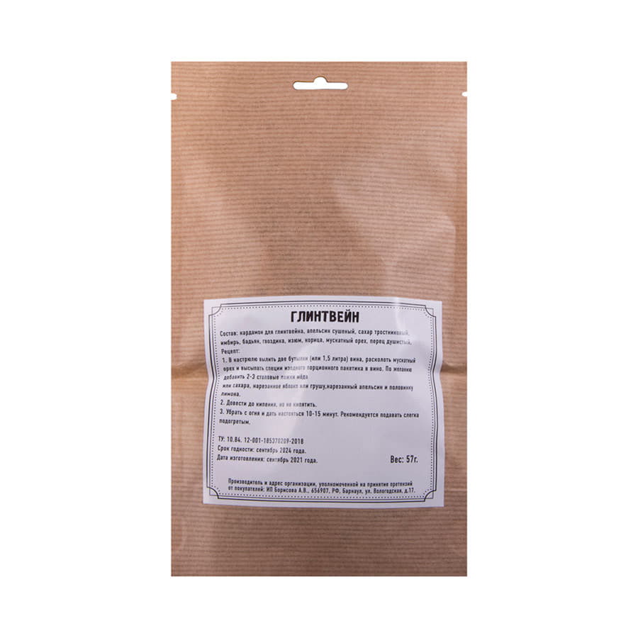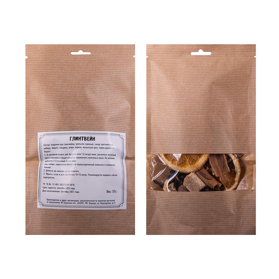 Состав: кардамон для глинтвейна, апельсин сушеный, сахар тростниковый, имбирь, бадьян, гвоздика, изюм, корица, мускатный орех, перец душистый.