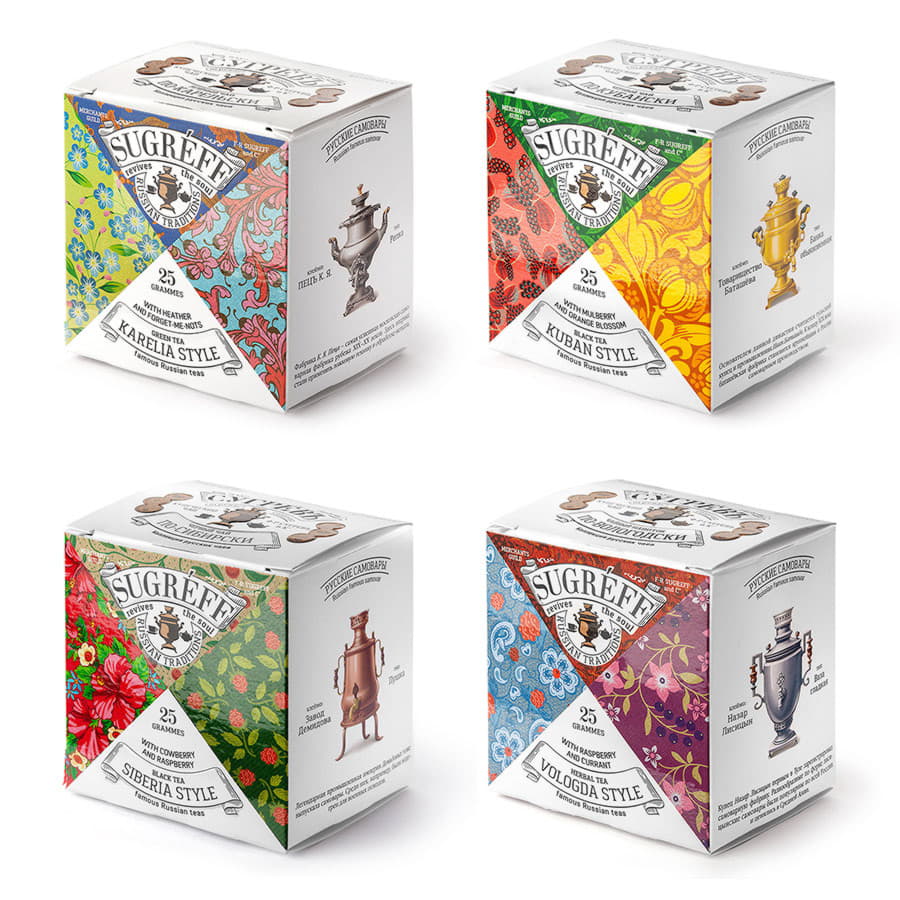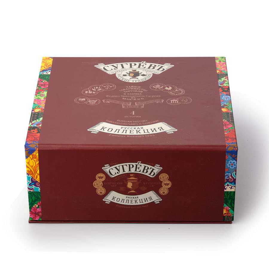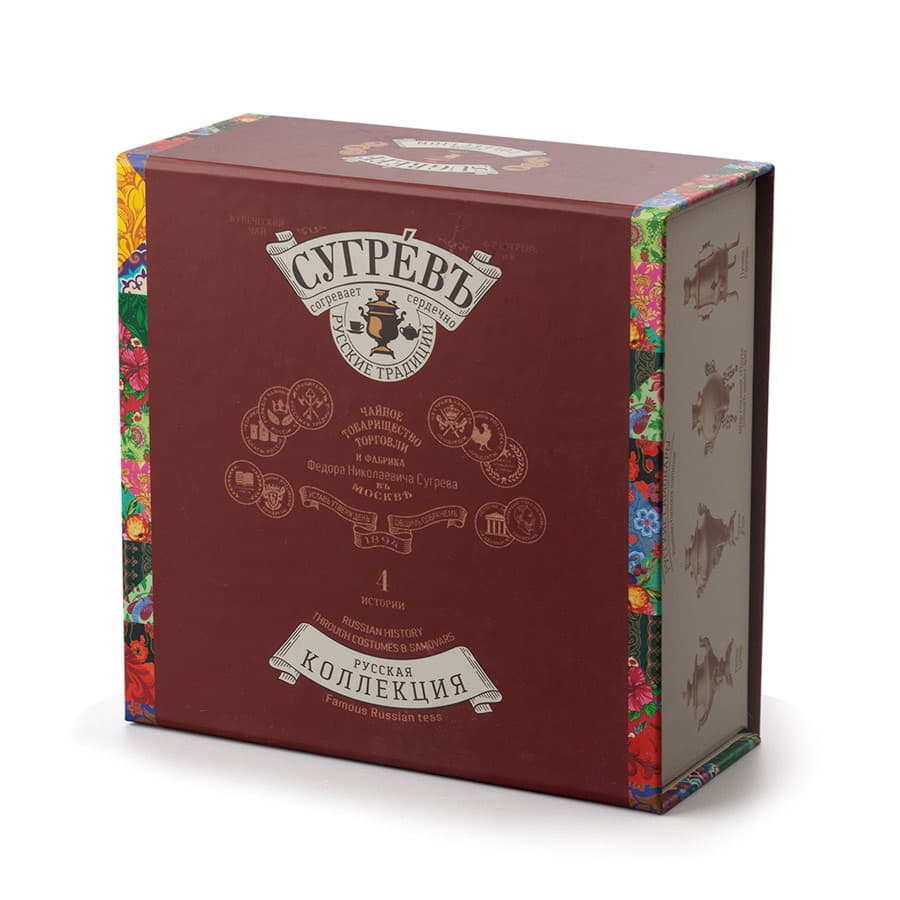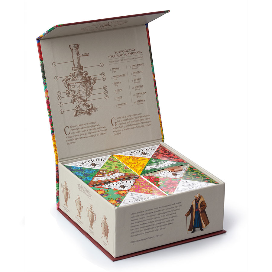 Подарочный набор из четырёх эксклюзивных купажей листового чая, трав и ягод, характерных для разных регионов России, в сувенирной шкатулке из переплётного картона с магнитным клапаном. Содержит подробную схему устройства русского самовара на русском и английском языках, а также карту Великого чайного пути, по которому чай доставляли из Пекина в Москву и Санкт-Петербург через города Кяхту, Иркутск, Омск, Ирбит, Тюмень, Казань и Нижний Новгород.