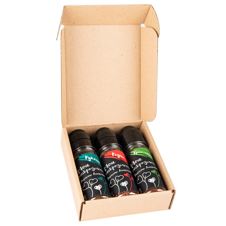 В состав набора входят семена руколы, редика, кресс-салата. Каждая бутылка с семенами оснащена дозатором.