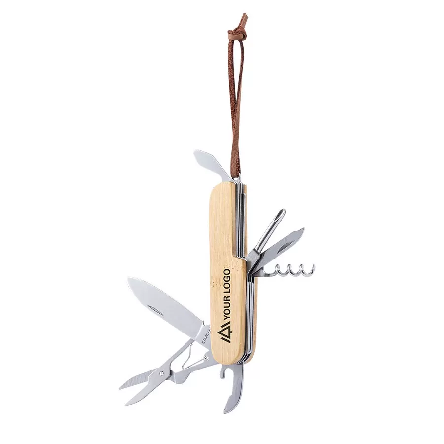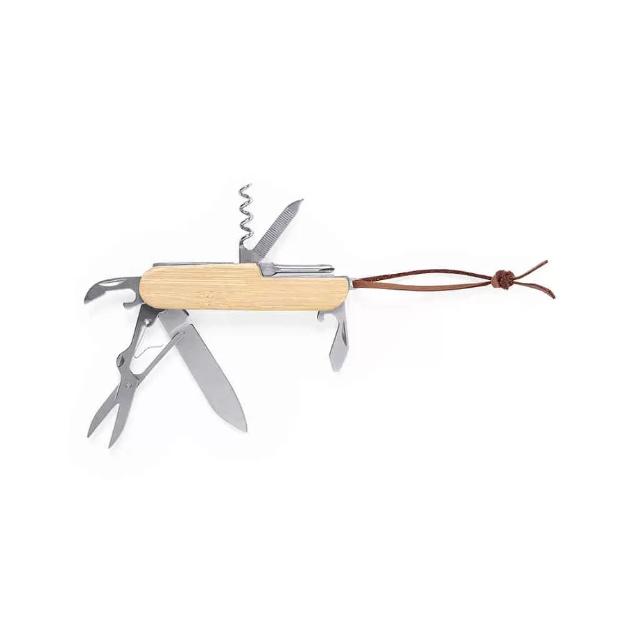 Карманный универсальный нож мультитул с 9 функциями. Механизм сделан из прочной нержавеющей стали, а ручка выполнена из натурального бамбука. Большой функционал, в том числе ножницы, большое и малое лизвие, отвертки шлицевая и крестовая, штопор для вина и консервный нож-открывашка, пилка для ногтей. Дополняет образ крепкого и натурального инстумента ремешок из кожзама. Нож мультитул станет верным спутником и незаменимым помощником для всех любителей путешествий и приключений.