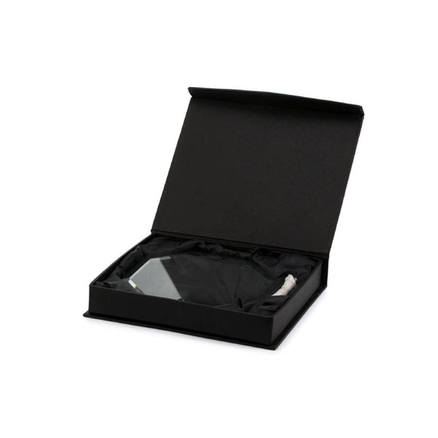 Награда в форме восьмиугольника из толстого стекла. Поставляется в подарочном футляре.
