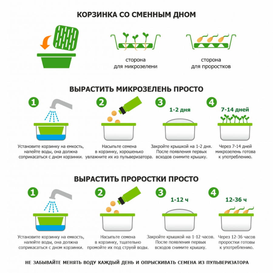 Проращиватель подходит для выращивания сочной микрозелени и проростков.
