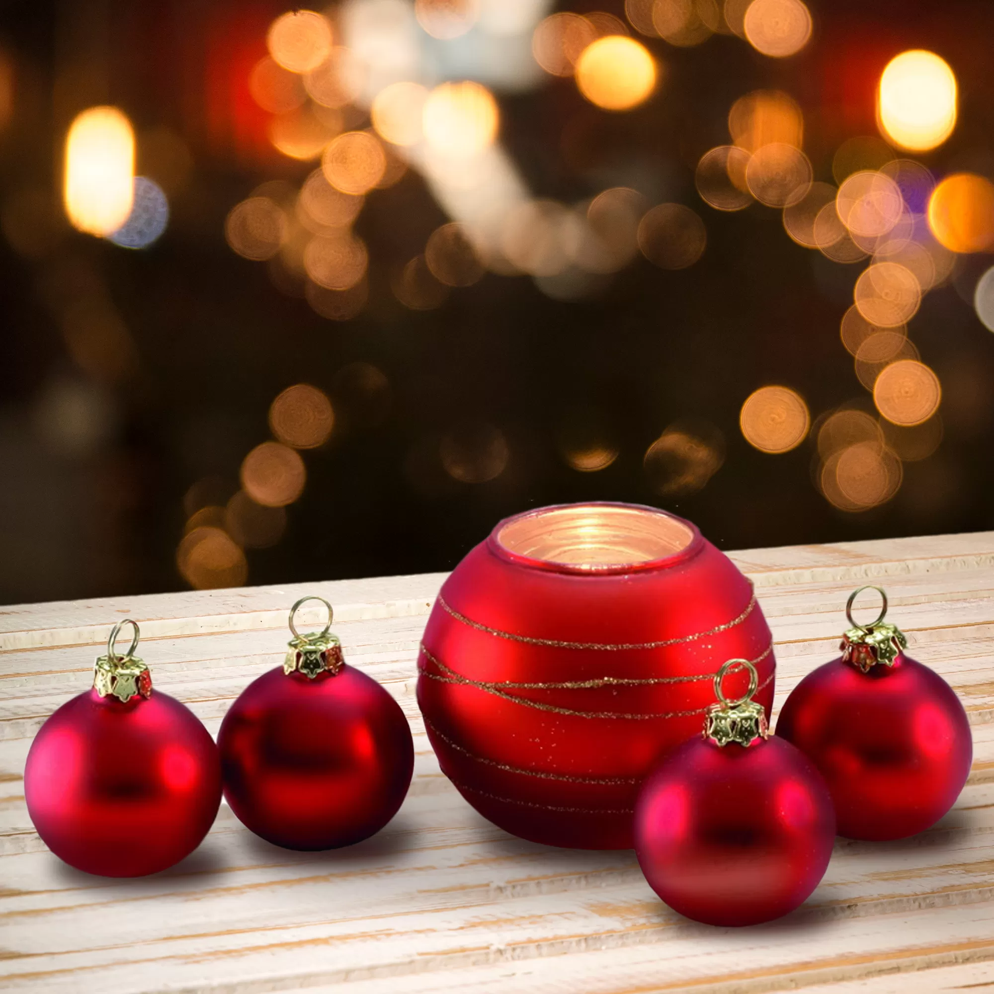 Набор: 4 ёлочных игрушки и подсвечник, красный