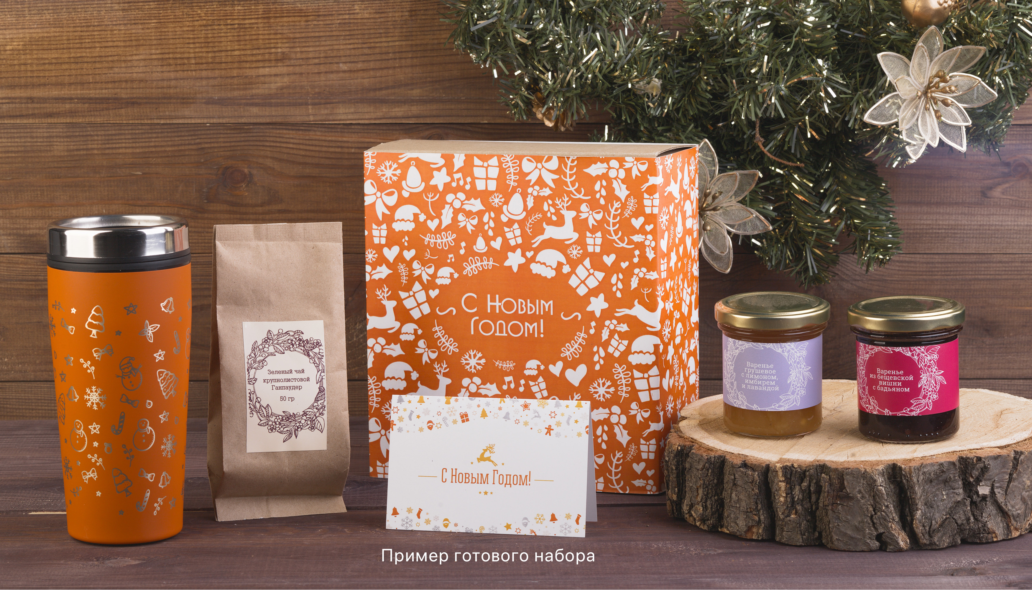 На втором фото показан вариант оформления набора. Полиграфическая продукция (шубер, открытка) в набор не входит, нанесение на стакан рассчитывается отдельно, согласно прайс-листу.