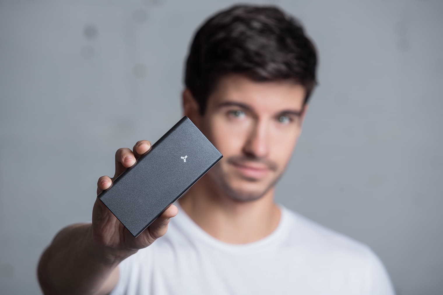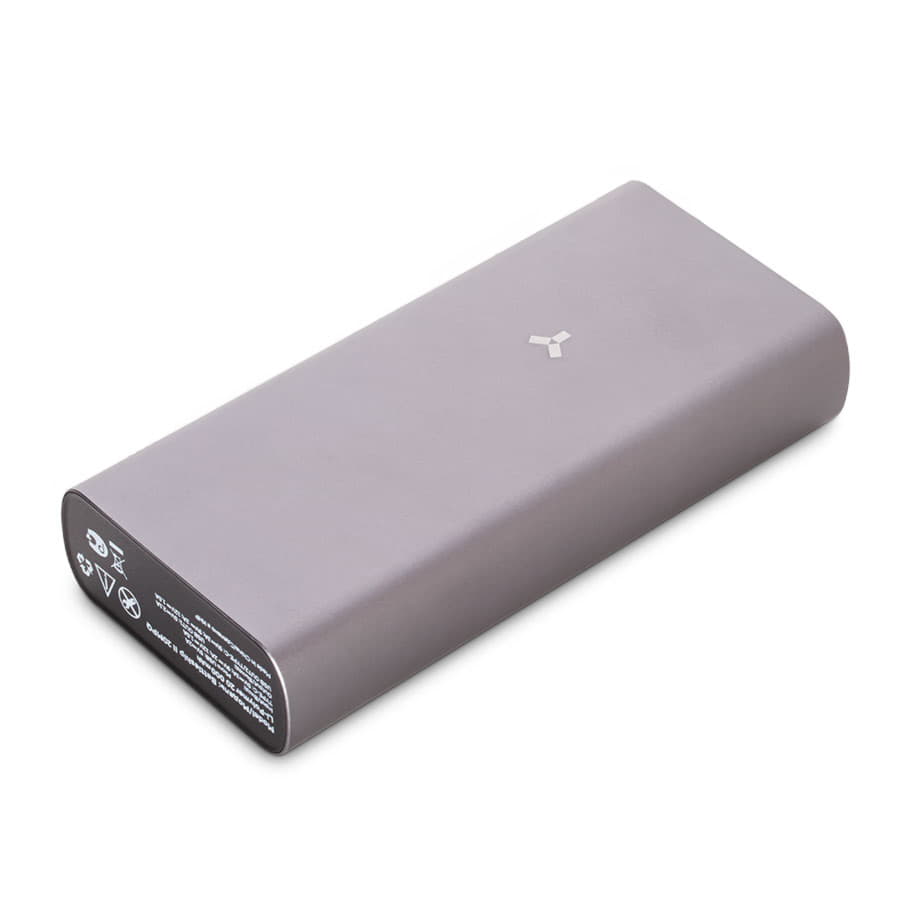 Мощный powerbank в металлическом корпусе. Темно-серый алюминий устойчив к повреждениям и смотрится строго и надежно.