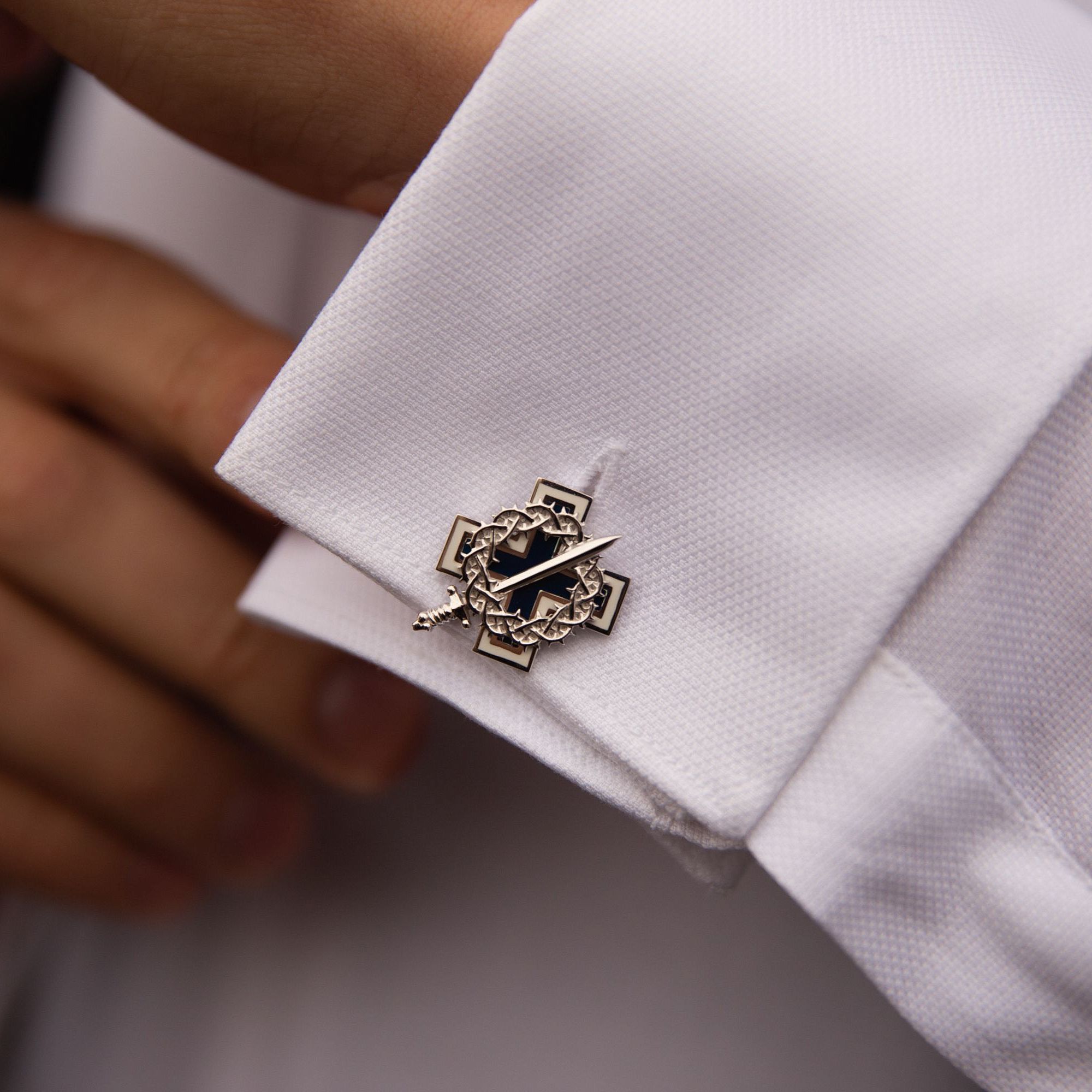 Крест, послуживший прототипом для этих запонок, являлся полковым нагрудным знаком Корниловского Ударного полка.Этот знак символизирует стойкость и возможность возрождения после трагических поражений.Модель представлена в белом золоте с бриллиантами и/или черной/синей эмалью.Белое золото 585-й пробы 17,5 г., черная эмаль.ХАРАКТЕРИСТИКИ:Коллекция: Белое ДелоМатериал: белое золото