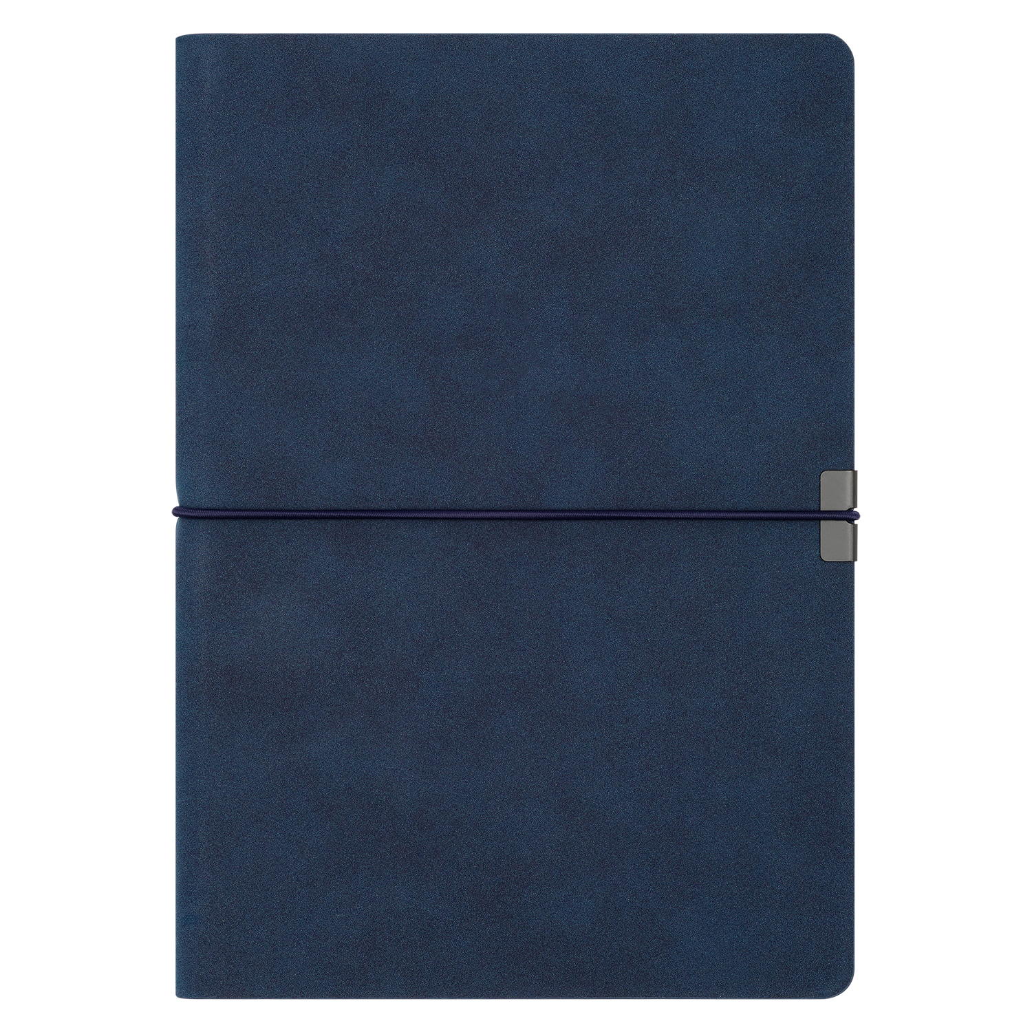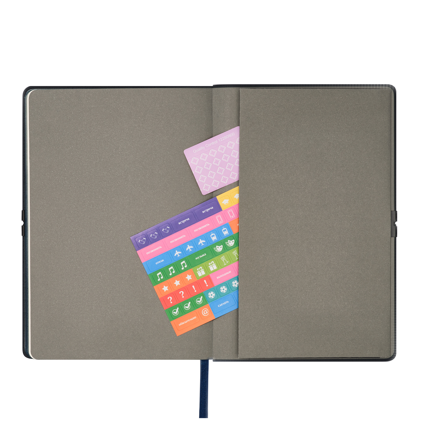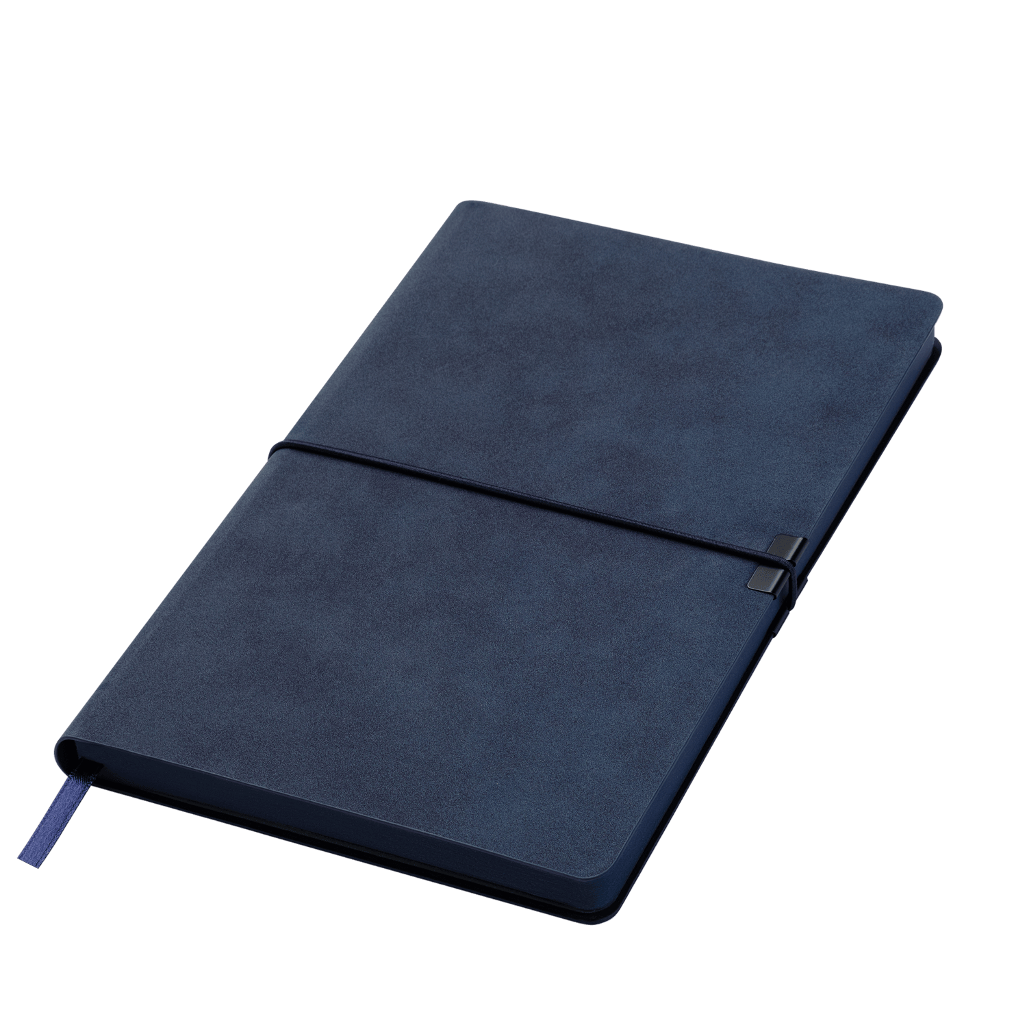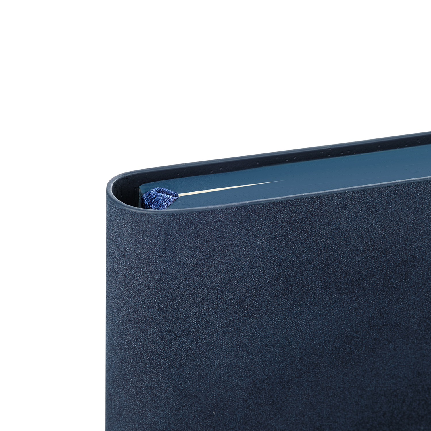 Коллекция In Velour - образец удачного сочетания минимализма со стильными элементами дизайна. Глубокий, чуть приглушенный темно-синий цвет мягкой обложки обыгрывается горизонтальной фиксирующей резинкой. Чтобы избежать повреждений обложки, на обеих ее сторонах под резинку установлен металлический фиксатор цвета черный никель - он не только улучшает внешний вид аксессуара, но и функционально полезен. Цветовой ансамбль дополняется и матовым цветным срезом, выполненным в тон обложке. Поверхность ежедневника приятна на ощупь: материал напоминает нубук и имеет бархатистую поверхность. Также эффектность аксессуара поддерживается контрастными форзацем и нахзацем серого цвета и светло-кремовыми страницами из гладкого, слегка шелковистого офсета. Темно-синее атласное ляссе органично завершает внешний вид ежедневника.