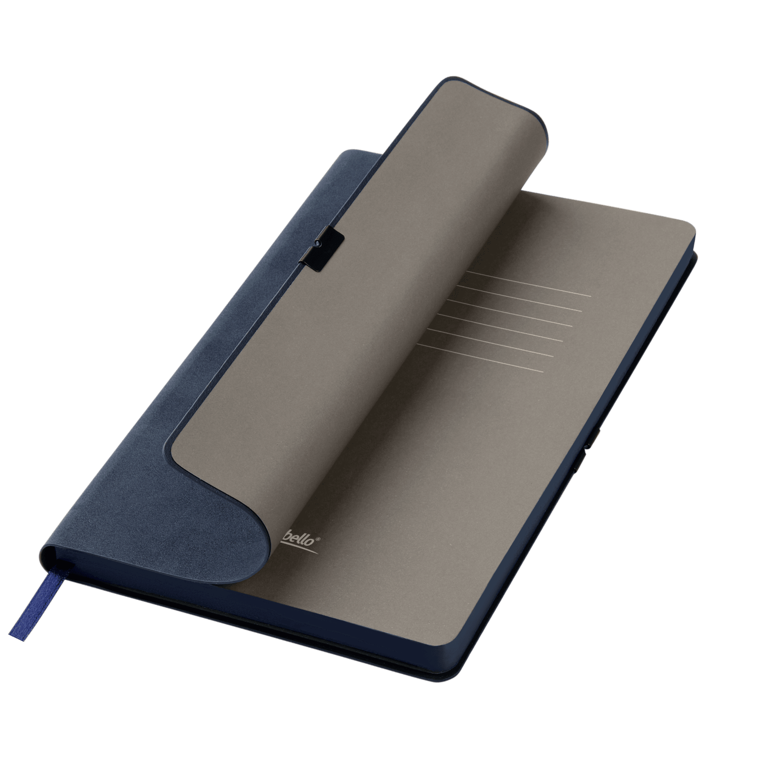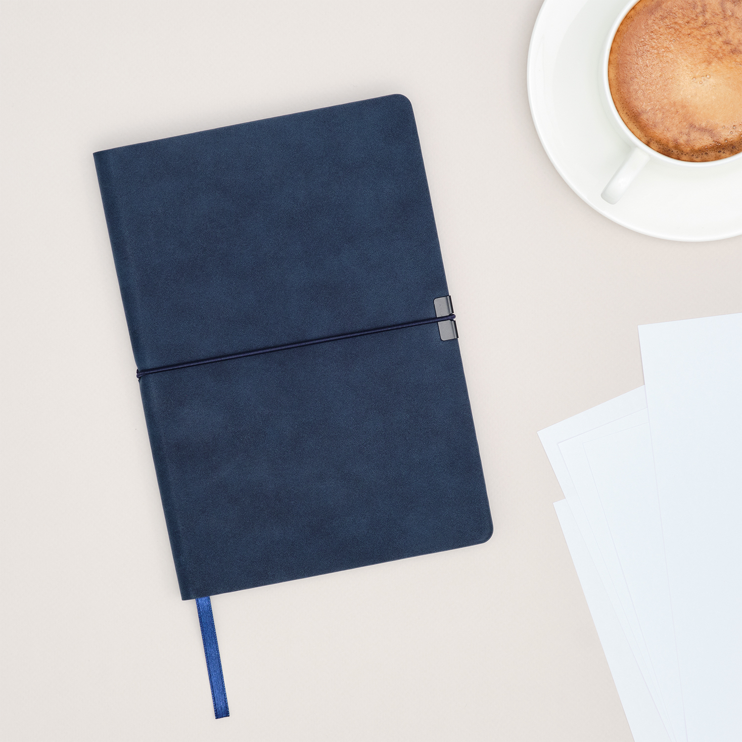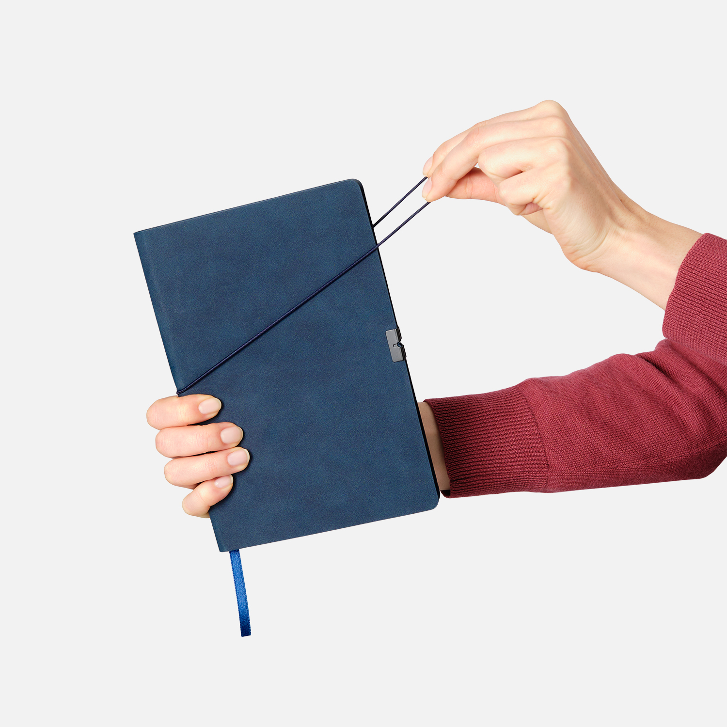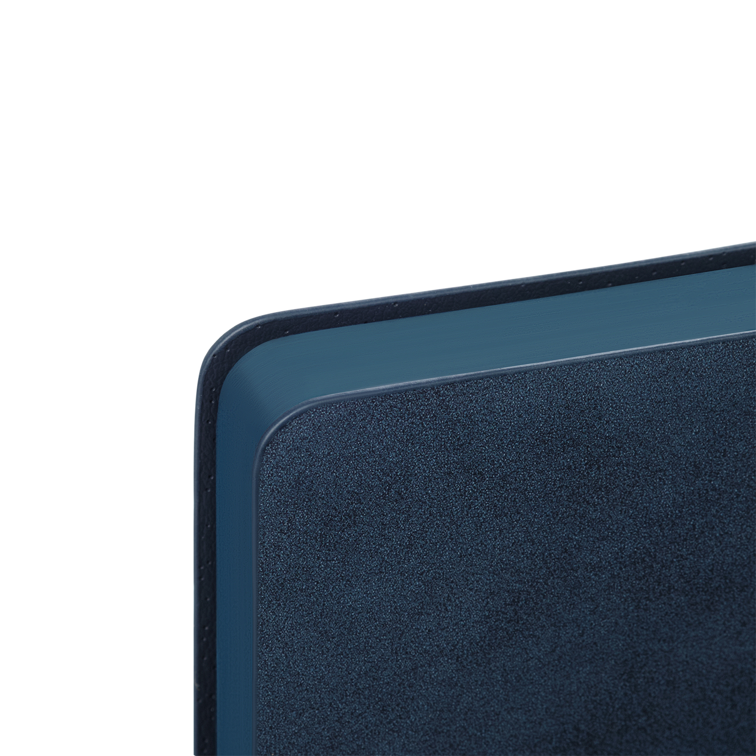 Коллекция In Velour - образец удачного сочетания минимализма со стильными элементами дизайна. Глубокий, чуть приглушенный темно-синий цвет мягкой обложки обыгрывается горизонтальной фиксирующей резинкой. Чтобы избежать повреждений обложки, на обеих ее сторонах под резинку установлен металлический фиксатор цвета черный никель - он не только улучшает внешний вид аксессуара, но и функционально полезен. Цветовой ансамбль дополняется и матовым цветным срезом, выполненным в тон обложке. Поверхность ежедневника приятна на ощупь: материал напоминает нубук и имеет бархатистую поверхность. Также эффектность аксессуара поддерживается контрастными форзацем и нахзацем серого цвета и светло-кремовыми страницами из гладкого, слегка шелковистого офсета. Темно-синее атласное ляссе органично завершает внешний вид ежедневника.